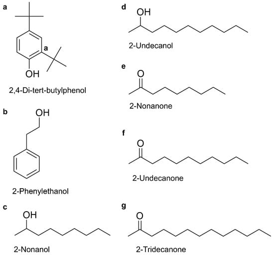 The chemical structures of seven toxic VOCs produced by E. americana and C. neteri; (a) 2,4-di-tert-butylphenol; (b) 2-phenylethanol; (c) 2-nonanol; (d) 2-undecanol; (e) 2-nonanone; (f) 2-undecanone; (g) 2-tridecanone.