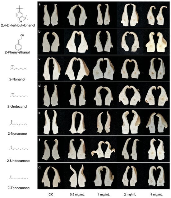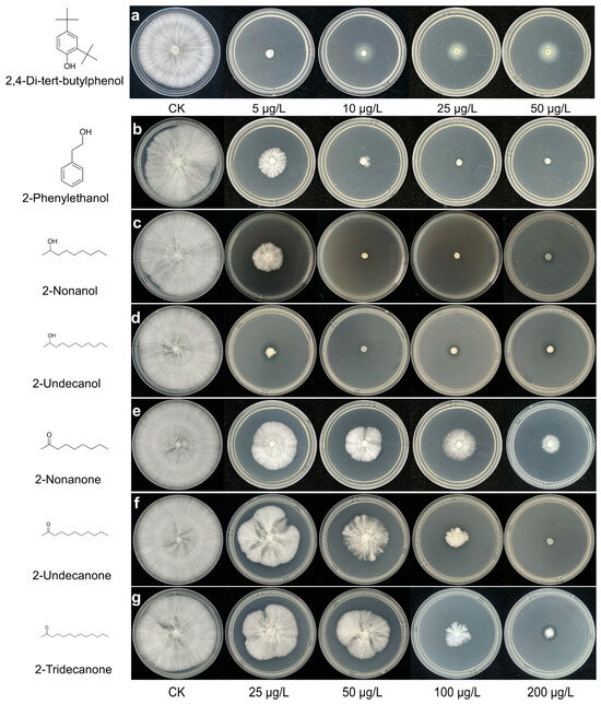 Symptoms of P. pulnomarius induced by different concentration of seven toxic VOCs. (a) 2,4-di-tert-butylphenol; (b) 2-phenylethanol; (c) 2-nonanol; (d) 2-undecanol; (e) 2-nonanone; (f) 2-undecanone; (g) 2-tridecanone. The control was a sterile 4% dimethyl sulfoxide aqueous solution used to dissolve the test compounds.