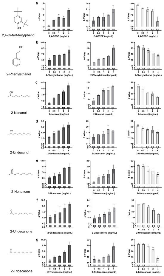 Colorimetric changes in P. pulmonarius fruiting bodies following topical application of seven toxic VOCs. (a) 2,4-di-tert-butylphenol; (b) 2-phenylethanol; (c) 2-nonanol; (d) 2-undecanol; (e) 2-nonanone; (f) 2-undecanone; (g) 2-tridecanone. Each panel shows the changes in L (lightness), a (red–green), and b (yellow–blue) values in response to individual VOC treatment. Threshold-dependent responses, with minimal changes at low concentrations but sharp increases in a and b at 4 mg/mL, suggesting critical concentration-triggered discoloration. Additionally, 2-tridecanone induced a steady loss of lightness (~3.5% per concentration step) and a consistent rise in a (+74.32%, +4.11), while b increased moderately (+29.42%, +4.46), indicating a predominantly browning effect. Lastly, 2-nonanol showed a distinct red-dominant profile (a: +62.92%, +3.30 at 4 mg/mL) with a relatively muted b response, suggesting suppression of yellowing pathways at high concentrations. These chromatic trends were consistent with the visible symptoms on fruiting bodies.