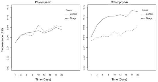 Fluorometry tests for the phage-inoculated cultures showed unexpected trends in growth biomass, measured in fluorometry units, when compared to the control cultures through the two-week inoculation period (Figure 2). For phycocyanin, both the control and the phage-inoculated culture significantly increased in pigmentation over time (p-value < 0.001) but no significance was observed between trend lines for the control and phage-inoculated cultures (p-value > 0.05). However, there was a significant difference between control and phage-inoculated cultures for chlorophyll-a pigmentation levels, the former exhibiting a significantly higher fluorescence trend level compared to the latter over time (p < 0.001).