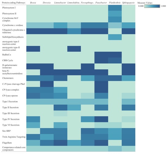 Metabolic pathways for eight identified bacterial genomes in this microcosm. Bacteria in order from left to right: Bosea, Devosia, Limnobacter, Limnohabitans, Novosphingobium, Paucibacter, Planktothrix, and Sphingopyxis, broken down by protein-coding pathways. Dark colored blocks are associated with the full presence of genes associated with a pathway (full pathway completion ranked as 1.0), while light colored blocks are associated with no presence of significant genes in the pathway (ranked as 0.0).