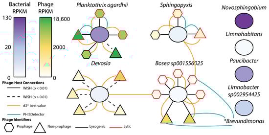 Interactions between microbial and phage genomes were identified and revealed viral-host links between four microbial genomes and the nineteen phage genomes (Figure 6). Phage genomes linked to P. agardhii were exclusive to that host, whereas the other microbial genomes (Devosia, Bosea, Sphingopyxis) had phage genomes tied to multiple hosts. This is likely indicative of the general exclusivity of cyanophage to cyanobacterial hosts, whereas bacteriophage genomes tend to have a more broad distribution of hosts [,]. More likely, though, this may be the result of different methodologies used to tie viruses to hosts. Because some methods used reference databases and some did not, phage linked to multiple hosts from different orders (all were members of Alphaproteobacteria class) may be false positives []. However, previous studies have identified phage capable of infecting hosts from different orders, so this finding may be possible []. Some phage genomes may have unidentified links to other microbial community members that did not assemble or bin well, such as Brevundimonas sp. Brevundimonas has been identified in freshwater lakes and bloom-infected waters, influencing cyanobacteria communities in various ways [,,]. Expanding this study to include replicates, and performing deeper sequencing may reveal additional microbial bins and phage–host links.