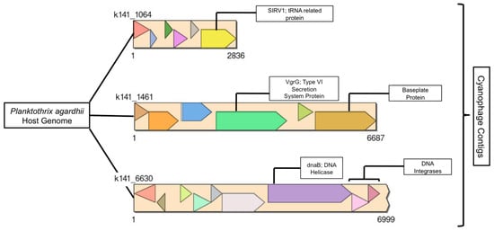 Three cyanophage contigs (k141_1064, k141_1461, and k141_6630) were found within the Planktothrix agardhii host genome as putative prophage, with several identifiable genes. Contigs were annotated and visualized using BLAST and SimpleSynteny, respectively.