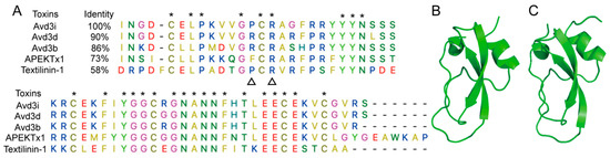 Structure of peptide Avd3i. (A) Residue sequences of Avd3i and its alignments with several Kunitz-type peptides. Cysteines and conserved residues are labeled with *, and residues predicted to be important for Kv channel inhibition are labeled with a triangle. (B,C) Predicted spatial structure of Avd3i obtained using SwissModel (B) and AlphaFold3 (C).
