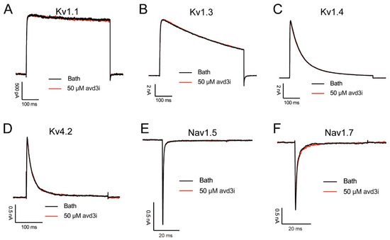 Kunitz-type peptides are a class of multifunctional peptides that not only act as protease inhibitors to regulate multiple protease activities but also inhibit ion channels, such as ShPI-1, which can inhibit various serine proteases and voltage-gated potassium ion channels [16]. Peptides Avd3d, Ael3a, and Avd3b belong to bifunctional Kunitz-type peptides, with high homology to Avd3i, and they exerted a high affinity to potassium channels. Avd3d and Avd3b showed an inhibitory ability on the Kv1.2 channel, with IC50 values of 1.3 μM and 2.8 μM, respectively [12,17]. Ael3a is a Kv1.1 channel blocker (IC50 of 0.9 nM), and we speculated that it would bind to the channel through a spatial electrostatic interaction, blocking the channel pores in an open state [13]. To assess the effect of peptide Avd3i on voltage-gated potassium channels, patch clamp recording was performed. As shown in Figure 3A–D, 50 μM of Avd3i was added to HEK cells transfected with different channel plasmids; however, Avd3i displayed no effect on potassium channels Kv1.1, Kv1.3, Kv1.4, or Kv4.2. We also assessed the effect of Avd3i on voltage-gated sodium channels Nav1.5 and Nav1.7, but the peptide exerted no function on either channel (Figure 3E,F).