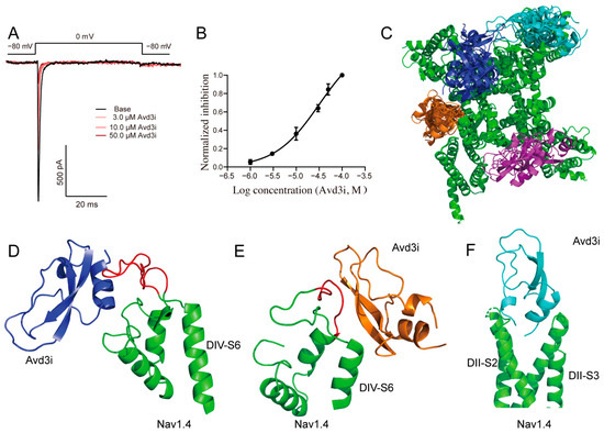Inhibitory effect of peptide Avd3i on Nav1.4 channels. (A) Current traces and effect–concentration relationship (B) of peptide Avd3i inhibiting the Nav1.4 channel. The relationship was fitted to Hill’s equation (n = 4). (C) In the molecular docking of peptide Avd3i with the Nav1.4 channel (PDB ID: 5XSY), the Nav1.4 channel is shown in green and different clusters of Avd3i are shown in dark blue, brown, purple, and cyan, respectively. (D–F) Representative poses of Avd3i binding to the Nav1.4 channel via molecular docking. The α helix structure of Avd3i interacting with the junction between Nav1.4 DIV-S6 and DIV-S5 (D), one β parallel sheet in Avd3i binds to the junction between Nav1.4 DIV-S6 and DIV-S5 (E), and the N-terminal and C-terminal in Avd3i were inserted into the cavern formed by Nav1.4 DII-S2 and DII-S3 (F).