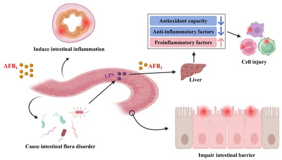 Upon entering the animal organs, AFB1 first impairs intestinal health, induces intestinal microbiota dysbiosis, and triggers intestinal inflammation. This sequence of events leads to intestinal cell damage and increased intestinal permeability, thereby enabling AFB1 and LPS (lipopolysaccharide) to translocate to the liver, where they induce inflammatory responses. Ultimately, such processes result in damage to other cells throughout the animal body (Figure 2). The negative effects of AFB1 to animals are shown in Table 1.