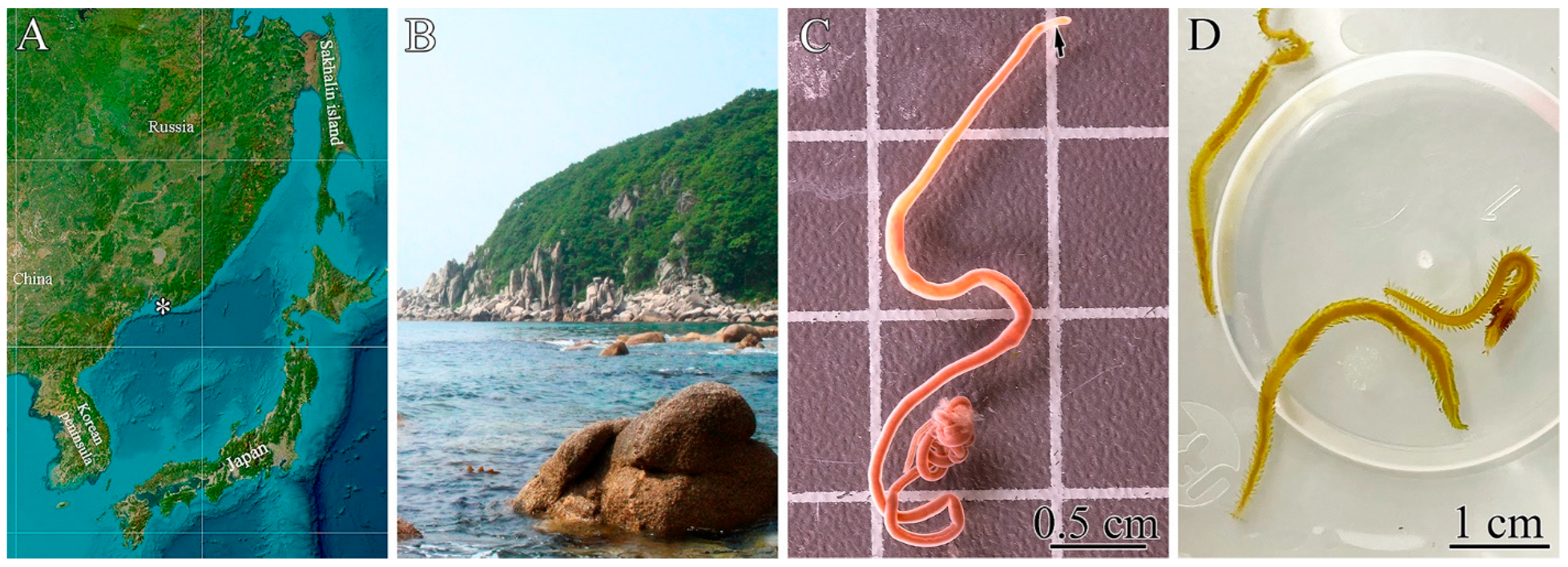 - Chernyshev, A.V. Nemerteans from the Far Eastern Seas of Russia. Russ. J. Mar. Biol. 2020, 46, 141–153. [Google Scholar] [CrossRef]