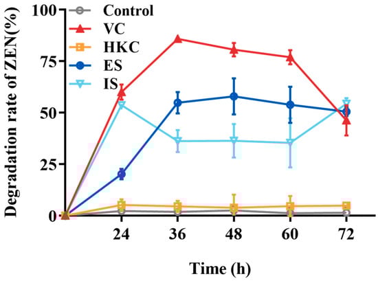 The ZEN transformation effects of different H. zeae treatments. VC stands for viable cells; HKC stands for heat-inactivated cells; ES stands for extracellular supernatant; IS stands for intracellular substances.