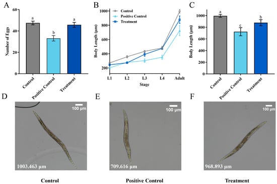 Transformation Product Safety Evaluation. (A) The oviposition of Caenorhabditis elegans (C. elegans) after exposure to different concentrations of ZEN; (B) the effects of different concentrations of ZEN on C. elegans body length; (C) the body length of C. elegans at each stage; (D–F) Detailed diagram of body length measurement. The ZEN concentration was 0 μg/mL in the control group, 5 μg/mL in the positive control group, and 0.7 μg/mL in the treatment group. The data presented in columns marked with distinct letters indicate statistically significant differences, as determined via Duncan’s New Multiple Range Test at a significance level of p < 0.05 (n = 10).