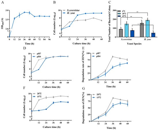 Tolerance of H. zeae to temperature and acidic stress. (A) The growth curve of strain H. zeae; (B) The growth of H. zeae and laboratory Saccharomyces cerevisiae (S. cerevisiae) at pH 4 The viability of yeasts was determined via dilution plating on NYDA plates; (C) The growth of H. zeae at different temperatures. * indicates p < 0.05 (statistically significant difference), and ** indicates p < 0.01 (highly statistically significant difference). (D) Growth curve under acidic stress conditions; (E) The transformation rate of ZEN under acidic stress conditions; (F) Growth curve under low temperature stress conditions; (G) The transformation rate of ZEN under low temperature stress conditions. The viability of yeasts was determined via dilution plating on NYDA plates. The data represent the mean ± SD (n = 3) at each time point. The data presented in columns marked with distinct letters indicate statistically significant differences, as determined via Duncan’s New Multiple Range Test at a significance level of p < 0.05 (n = 3).