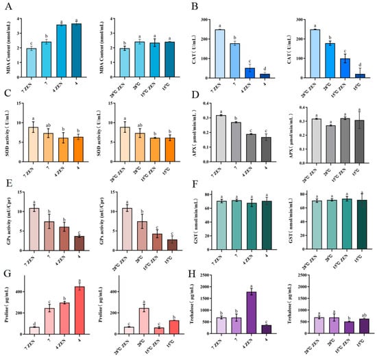 The Influence of ZEN on the generation of oxidative stress in H. zeae. (A) Malondialdehyde. (B) Catalase (CAT). (C) Superoxide dismutase. (D) Ascorbate peroxidase (APX). (E) Glutathione peroxidase (GPx). (F) Glutathione S-transferase (GST). (G) Proline. (H) Trehalose. The data presented in columns marked with distinct letters indicate statistically significant differences.