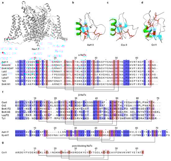 Three-dimensional structures and sequence alignments of representative scorpion NaTx and their target channel. (a) The structure of the Nav1.7 channel (PDB: 6J8G). (b) The structures of α-NaTx (AaH II, PDB: 1AHO; Ts1, PDB: 1B7D). (c) The structures of β-NaTx (Css II, PDB: 2LI7; Cn2, PDB: 1CN2). (d) Structure of a pore-blocking NaTx, Cn11 (PDB: 1PE4). (e) Multiple sequence alignment of representative α-NaTx. (f) Multiple sequence alignment of representative β-NaTx. (g) Multiple sequence alignment of representative pore-blocking NaTx. In the three-dimensional structures, α-helices are highlighted in green, β-strands are highlighted in cyan, and disulfide bonds are shown in red. In the sequence alignments, cysteine residues are highlighted in red, disulfide bonds are indicated by black connecting lines, and functionally important amino acid residues are marked in red. All structures were obtained from RCSB PDB.