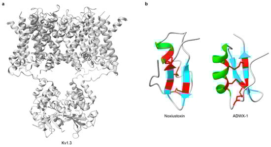 Three-dimensional structures of representative scorpion KTx and their target channel. (a) The structure of the Kv1.3 channel (PDB: 7SSX). (b) The structures of KTx (Noxiustoxin, PDB: 1SXM; ADWX-1, PDB: 2K4U). In the three-dimensional structures, α-helices are highlighted in green, β-strands are highlighted in cyan, and disulfide bonds are shown in red. All structures were obtained from RCSB PDB.