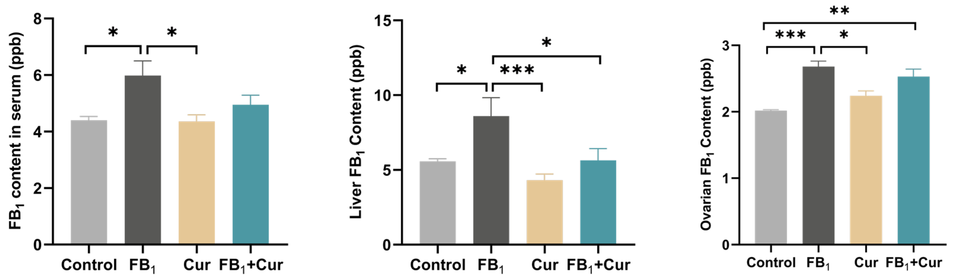 2.3. FB1 Residues of FB1 Exposure and Cur Treatment Ducks