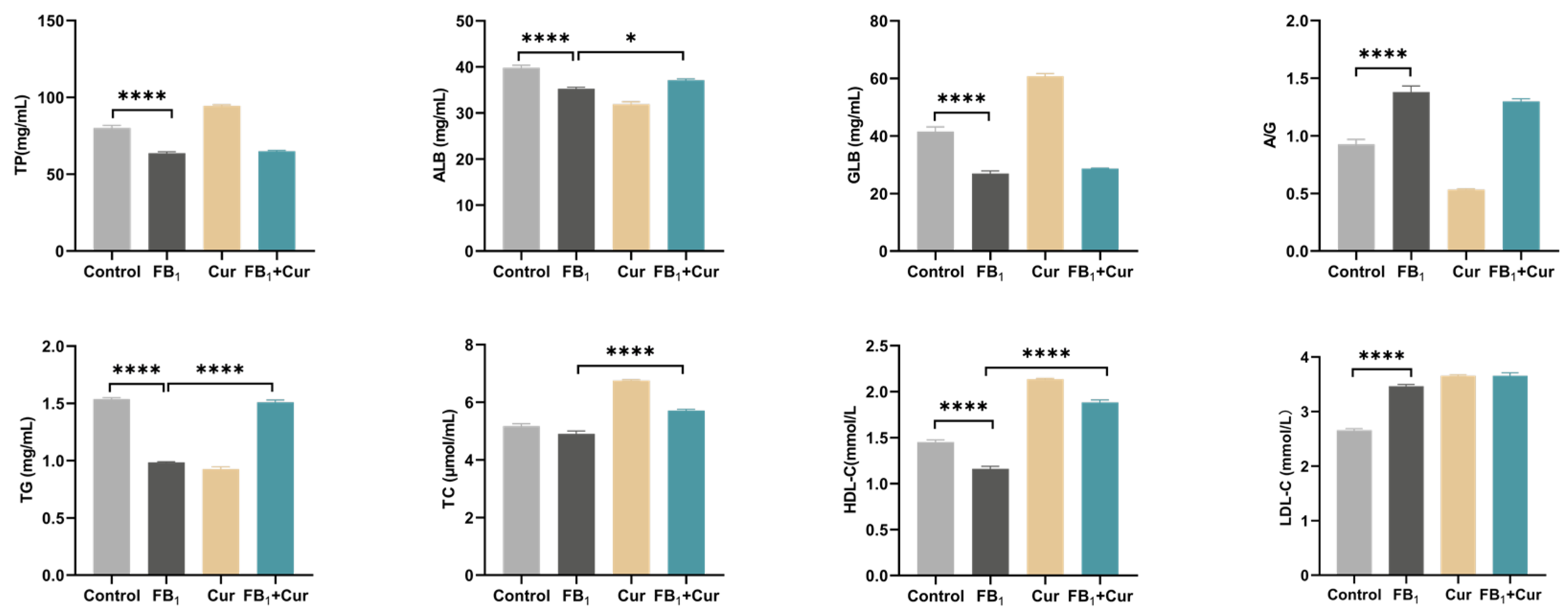 2.5. The Effect of FB1 and Cur on Serum Biochemical Indices in Peak-Laying Ducks