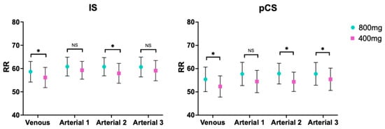 When comparing the same route and rate of administration between the two doses (800 mg vs. 400 mg), there were differences in both venous route (p-value 0.0408 and p-value 0.0168, respectively) and in the 2-h administration (p-value 0.0183 and p-value 0.0132, respectively) for IS and pCS, respectively. Regarding the longest time of administration, there were only statistically significant differences for pCS (p-value 0.0459). Last, the 1-h administration did not show differences (Table 5 and Figure 3).