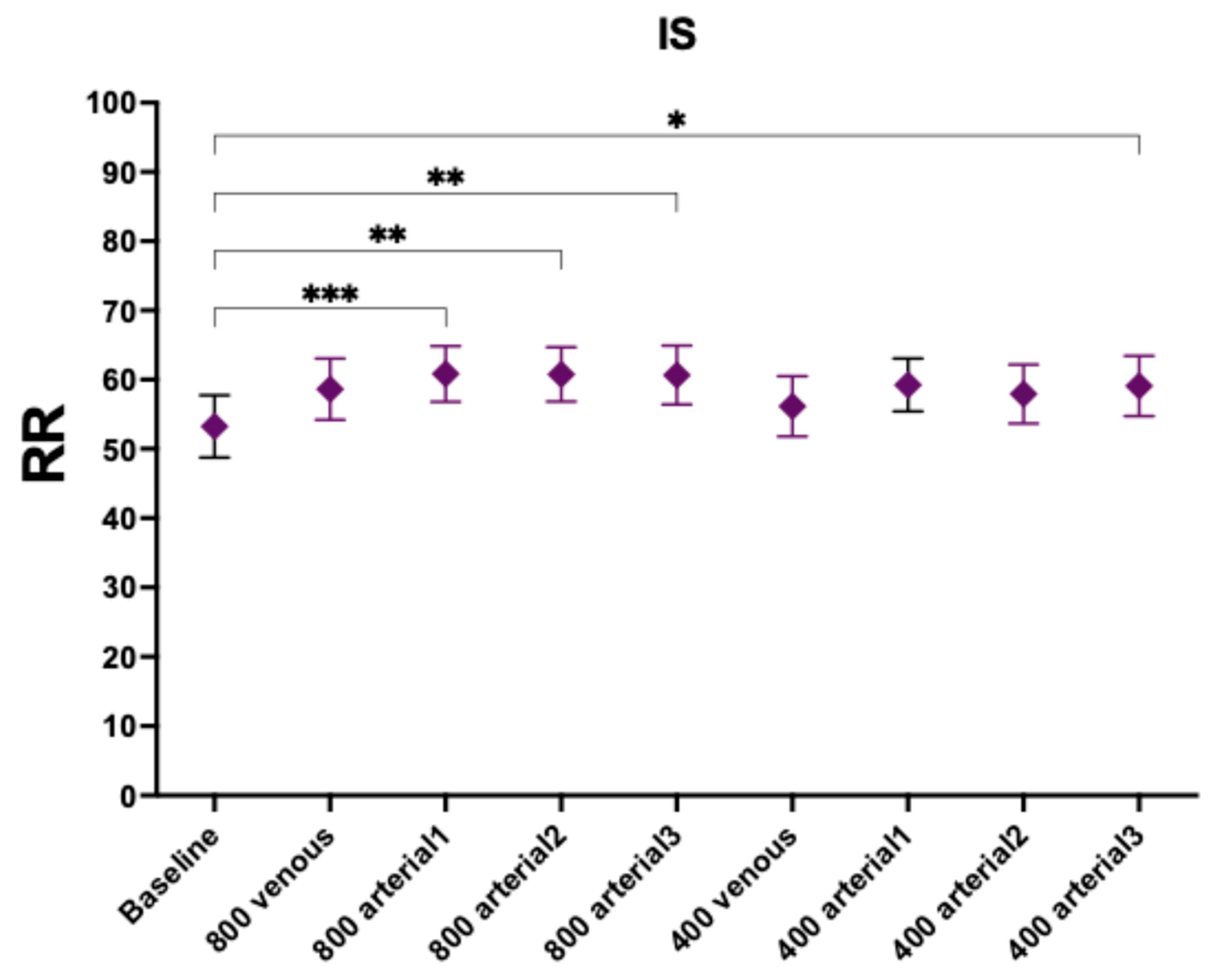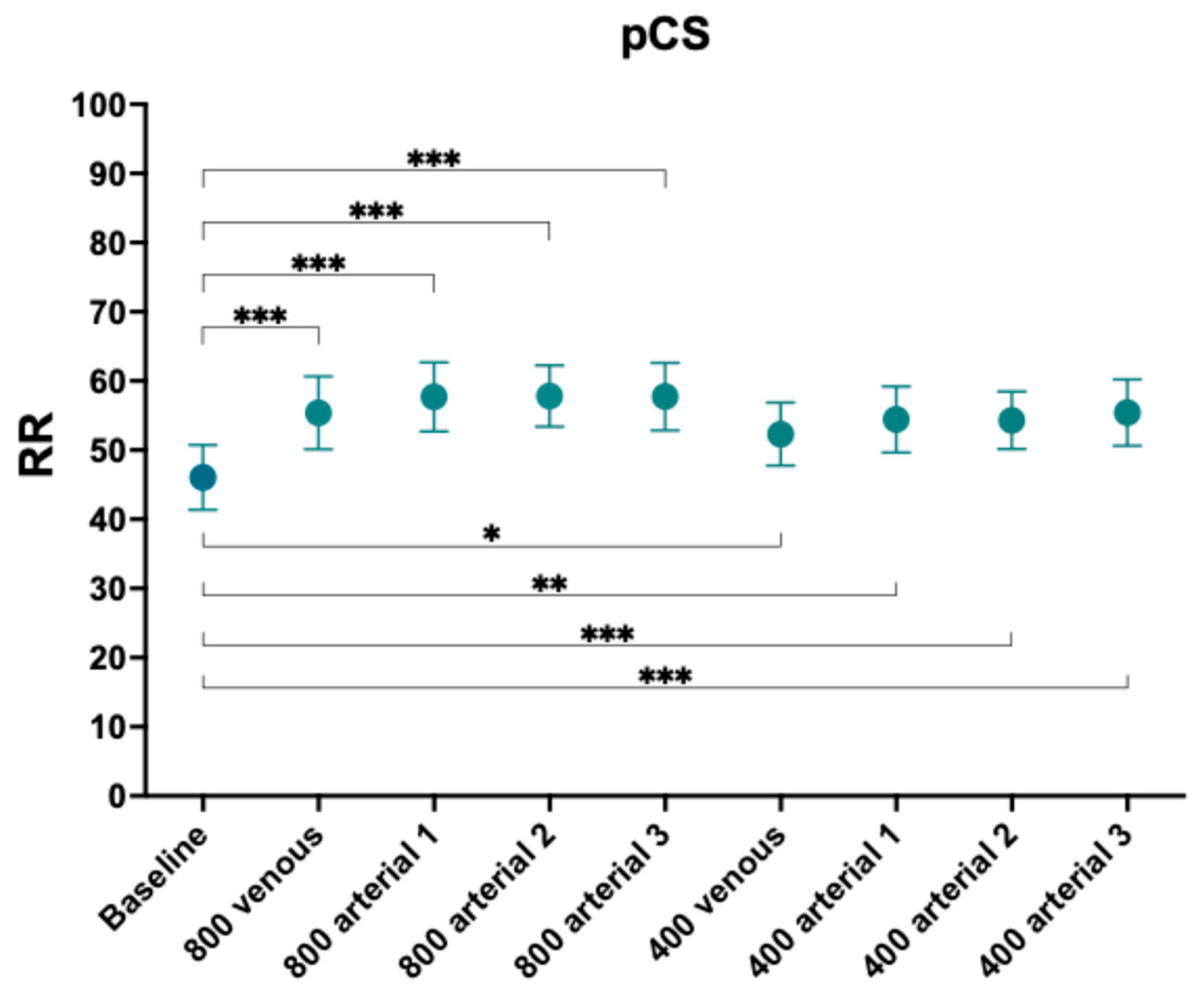 | Baseline vs. 800 arterial3 | −7.395 | −12.86 to −1.930 | 0.0053 | −11.69 | −17.35 to −6.032 | <0.0001 |