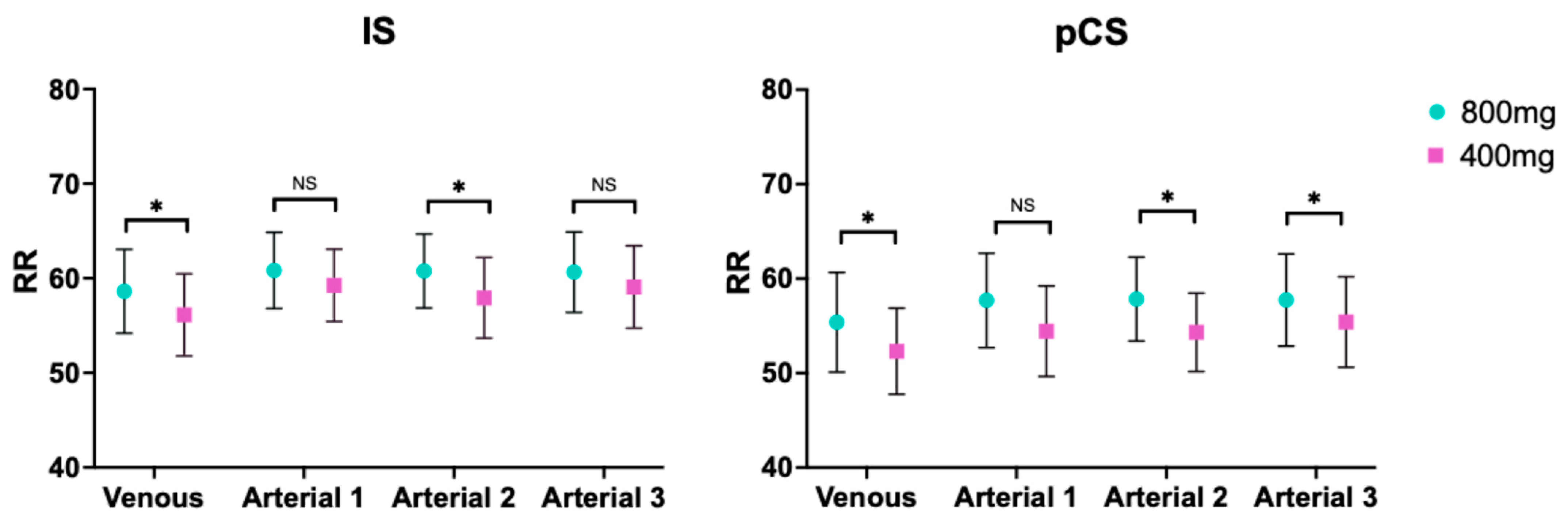 | 800 arterial 1 vs. 400 arterial 1 | −1.581 | −4.640 to 1.478 | 0.1469 | −3.267 | −7.746 to 1.213 | 0.0719 |