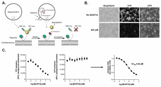 The BoSapient cell line is an engineered human neuroblastoma cell line that stably expresses a reporter consisting of full-length SNAP-25 expressed between N-terminal CFP and C-terminal YFP moieties (Figure 1A). Upon expression, the reporter is targeted to and associates with the plasma membrane through palmitoylation of cysteine residues in SNAP-25. In the absence of toxins, excitation of the cells at ~505 nm results in strong YFP emission at ~527 nm. When BoNT/A is present, the toxin (1) binds to cell-surface receptors and (2) is internalized through endocytosis. The BoNT/A light chain (Lc/A) then (3) translocates into the cytosol, where it then (4) cleaves the reporter’s SNAP-25 sequence, releasing a fragment containing residues 198–206 of SNAP-25 and the YFP moiety. This fragment is then rapidly degraded by the cell, resulting in a decrease in YFP emissions that is visualized by fluorescence microscopy (Figure 1B) or measured on a fluorescent plate reader. The CFP-containing fragment remains bound to the plasma membrane and is not degraded, allowing for the normalization of the decrease in the YFP signal based on protein expression at the site of measurement. The reporter readout is notably different than that shown by Dong et al., where decreases in FRET between YFP and CFP were used to detect BoNT activity [30]. Here, BoNT activity is detected solely by the loss of directly excited YFP emissions.