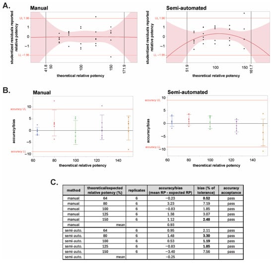 Linearity and bias of the semi-automated and manual BoSapient CBPA methods. (A) Quadratic plots of the studentized residuals of all results of the manual (left) and semi-automated (right) method qualifications were constructed as a function of theoretical relative potency and used to establish the linear range of the methods. Red shading represents the limits of the 95% confidence interval (CI). A studentized residual limit of ±1.96 was used to determine the upper (UL) and lower (LL) limits of the assay’s linear range. (B) Accuracy or bias, the difference between the mean measured RP value and the expected RP value at each tested theoretical concentration, was determined for the manual (left) and semi-automated (right) method qualification data and plotted versus theoretical potency. Based on typical 80–125% drug product specification limits, a bias limit of ±9 was calculated (20% of tolerance). (C) Accuracy results and acceptance status for all tested concentrations in the two methods.