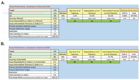 Predicted OOS rates for the manual (A) and semi-automated (B) BoSapient CBPA methods. To determine the out-of-specification (OOS) rate as a percentage or in parts per million (PPM), the mean including analytical bias and the associated method standard deviation was determined from the method qualification data. Applying lower (80%, LSL) and upper (125%, USL) specification limits, the area under the normal curve outside of the specification limits was then calculated using the following equations: %OOS = (1 − NORMSDIST((Mean − USL)/standard deviation) + NORMSDIST((Mean − LSL)/standard deviation)) × 100 and OOS rate PPM = (1 − NORMSDIST((Mean − USL)/standard deviation) + NORMSDIST((Mean − LSL)/standard deviation)) × 1 × 106.