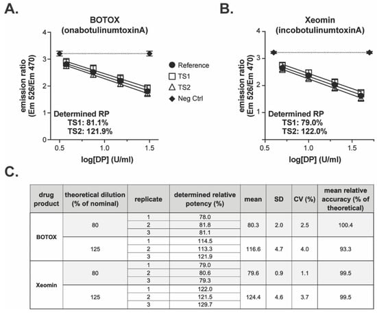 Testing of commercial drug product with the semi-automated BoSapient CBPA method: CBPAs were executed as described in Section 4. Test samples were formulated to 80 or 125% of a 30 U/mL (BOTOX) or 40 U/mL (Xeomin) nominal concentration. Reference samples were formulated to 100% of the nominal concentration. Example CBPA runs for BOTOX (A) and Xeomin (B) are shown. Emission ratio was plotted as a function of drug product concentration assuming 100% nominal concentrations. (C) Relative potency results from three replicate CBPA runs of the semi-automated method for both BOTOX and Xeomin.