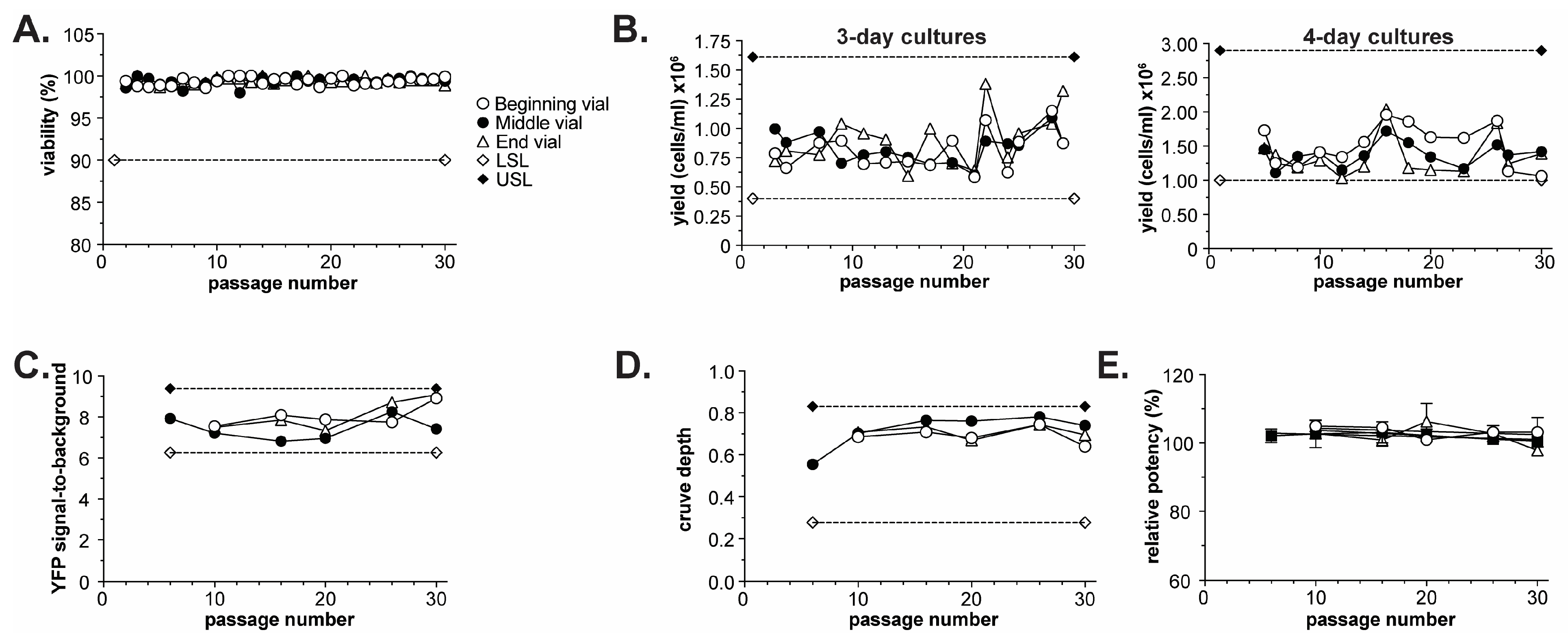 Figure 3. Passage stability of the BoSapient cell line. Three vials, filled at the beginning (3/300), middle (151/300), or end (297/300) of a 300-vial master cell bank, were thawed from liquid nitrogen and passaged every 3–4 days (see Section 4). Every 5 ± 2 passages, 4-day cultures were subjected to a CBPA, as described in Section 4. (A) Cell viability during passaging at the indicated passage number for cultures derived from the three vials. A lower specification limit (LSL) of 90% was applied to the study. (B) Cell yields for 3- (left) and 4-day (right) cultures at the indicated passage number for cultures derived from the three vials. LSL and upper specific limit (USL) are based on yields obtained from the cell line during development. (C) YFP signal-to-background from execution of CBPAs as a function of passage number for all three vials. YFP signal-to-background was calculated by dividing the YFP emissions from assay plate wells containing cells but no BoNT/A (negative control) by the YFP emissions from wells containing no cells (blank). LSL and USL are calculated from mean from all CBPA runs ± 20%. (D) CBPA curve depth as a function of passage number for all three vials. Curve depth was calculated by subtracting the emission ratio (assay response) at the highest BoNT/A concentration from the emission ratio at the lowest BoNT/A concentration. LSL and USL are set as the beginning curve depth (passage 6) ± 50%. (E) CBPA relative potency results as a function of passage number and vial.