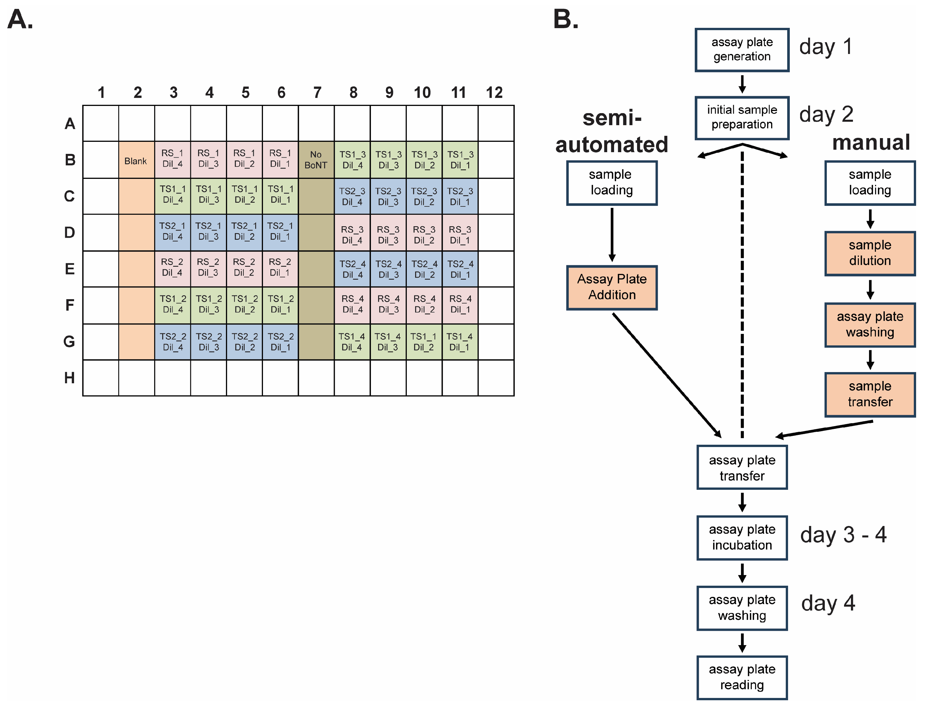 Figure 4. Semi-automated and manual operation of relative potency methods using the BoSapient CBPA. (A) Final assay plate layout for both the manual and semi-automated methods. Reference sample (RS, pink), test sample 1 (TS1, green), and test sample 2 (TS2, blue) serial dilutions (i.e., Dil_1, Dil_2, Dil_3, Dil_4) are applied in quadruplicate (e.g., RS-1, RS-2, RS-3, and RS-4) with each replicate independently diluted in parallel. Wells containing no cells (Blank, orange) or cells with no BoNT/A (dark green) are included as controls. Replicates are arrayed to minimize plate effects. (B) Workflow of the semi-automated and manual CBPA methods. Operator-performed actions for each method are shown in boxes. Both methods share cell maintenance, assay plate seeding, and initial sample preparation/suspension procedures but diverge during sample serial dilution, assay plate washing, and sample application procedures; these actions are fully automated in the semi-automated method. Thus, the operator only needs to insert the assay plate into the platform when prompted. Operator-performed steps that diverge between the manual and semi-manual methods are highlighted in orange.