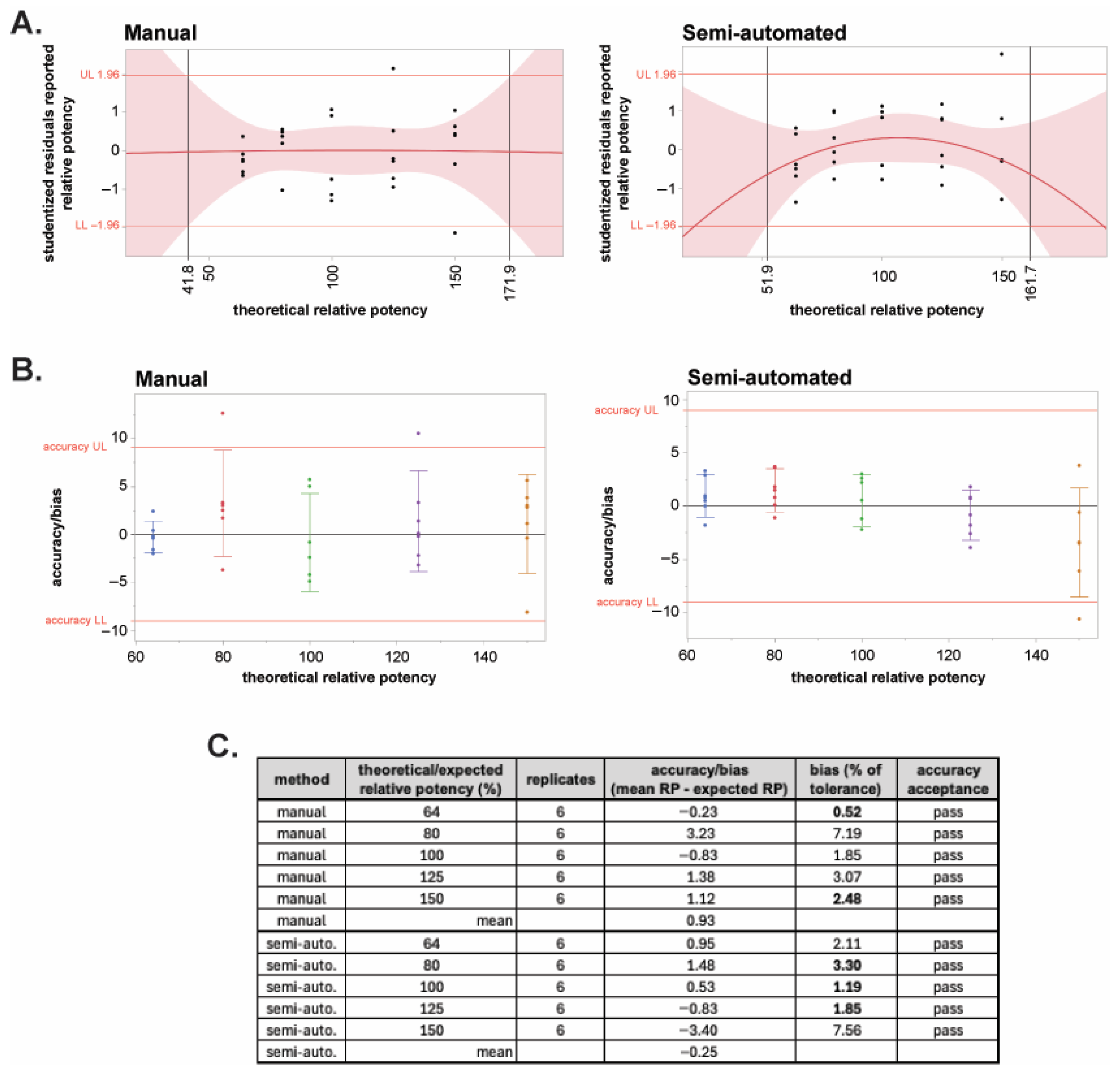 Figure 6. Linearity and bias of the semi-automated and manual BoSapient CBPA methods. (A) Quadratic plots of the studentized residuals of all results of the manual (left) and semi-automated (right) method qualifications were constructed as a function of theoretical relative potency and used to establish the linear range of the methods. Red shading represents the limits of the 95% confidence interval (CI). A studentized residual limit of ±1.96 was used to determine the upper (UL) and lower (LL) limits of the assay’s linear range. (B) Accuracy or bias, the difference between the mean measured RP value and the expected RP value at each tested theoretical concentration, was determined for the manual (left) and semi-automated (right) method qualification data and plotted versus theoretical potency. Based on typical 80–125% drug product specification limits, a bias limit of ±9 was calculated (20% of tolerance). (C) Accuracy results and acceptance status for all tested concentrations in the two methods.