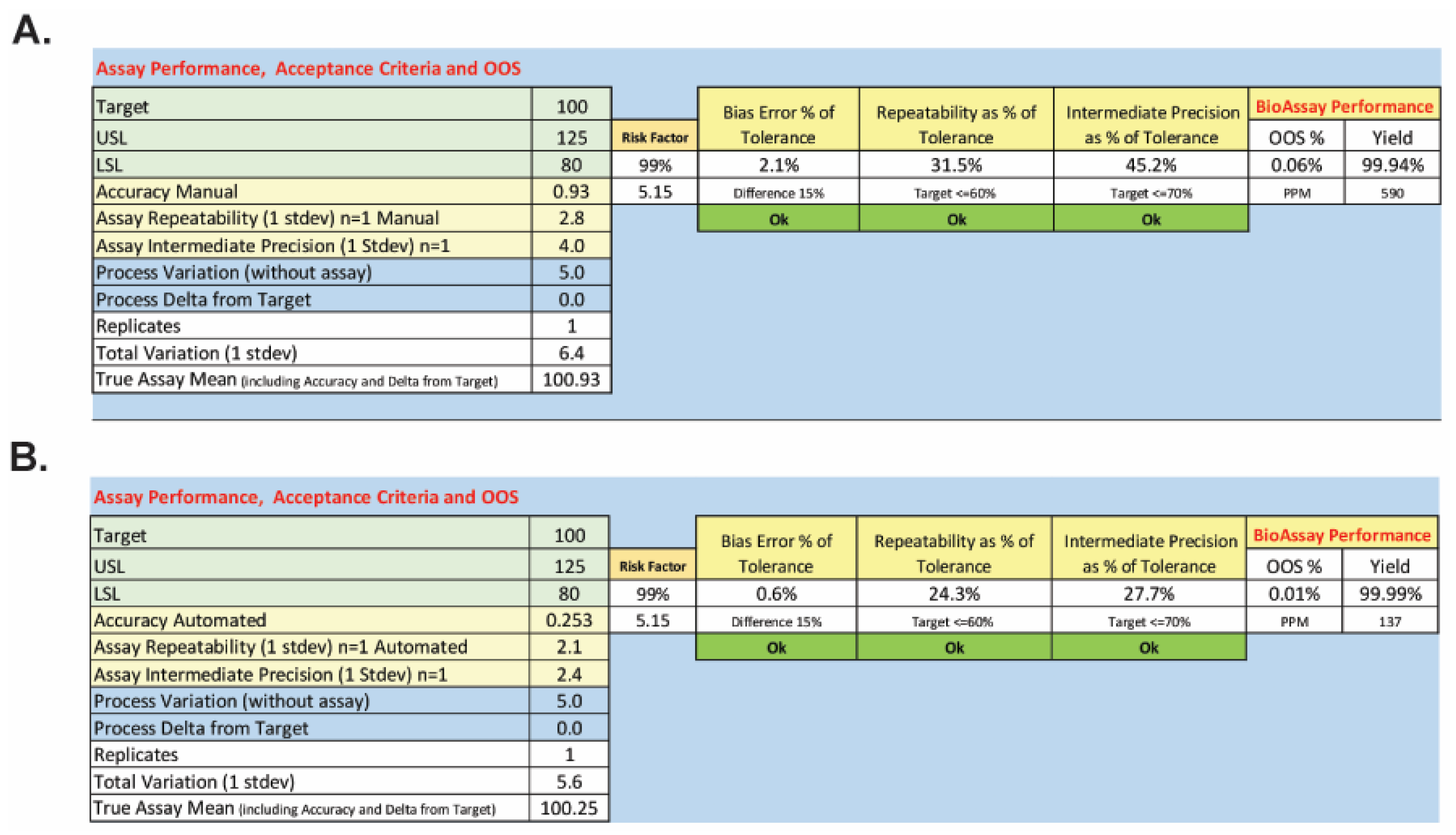 Figure 7. Predicted OOS rates for the manual (A) and semi-automated (B) BoSapient CBPA methods. To determine the out-of-specification (OOS) rate as a percentage or in parts per million (PPM), the mean including analytical bias and the associated method standard deviation was determined from the method qualification data. Applying lower (80%, LSL) and upper (125%, USL) specification limits, the area under the normal curve outside of the specification limits was then calculated using the following equations: %OOS = (1 − NORMSDIST((Mean − USL)/standard deviation) + NORMSDIST((Mean − LSL)/standard deviation)) × 100 and OOS rate PPM = (1 − NORMSDIST((Mean − USL)/standard deviation) + NORMSDIST((Mean − LSL)/standard deviation)) × 1 × 106.