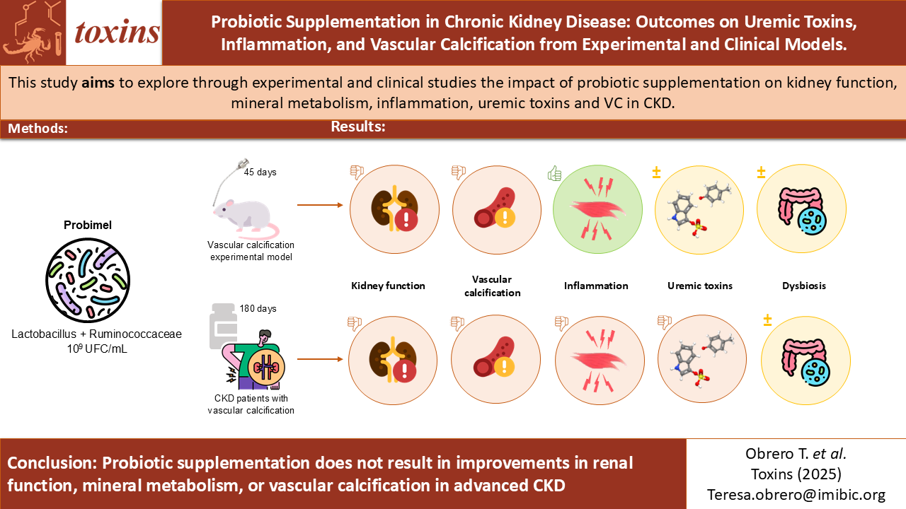 Obrero T, Pendón-Ruiz de Mier MV, Gordillo-Arnaud JE, Jiménez Moral MJ, Vidal V, Guerrero F, Carmona A, Rodríguez-Ortiz ME, Torralbo AI, Ojeda R, et al. Probiotic Supplementation in Chronic Kidney Disease: Outcomes on Uremic Toxins, Inflammation, and Vascular Calcification from Experimental and Clinical Models. Toxins. 2026; 18(1):6. https://doi.org/10.3390/toxins18010006