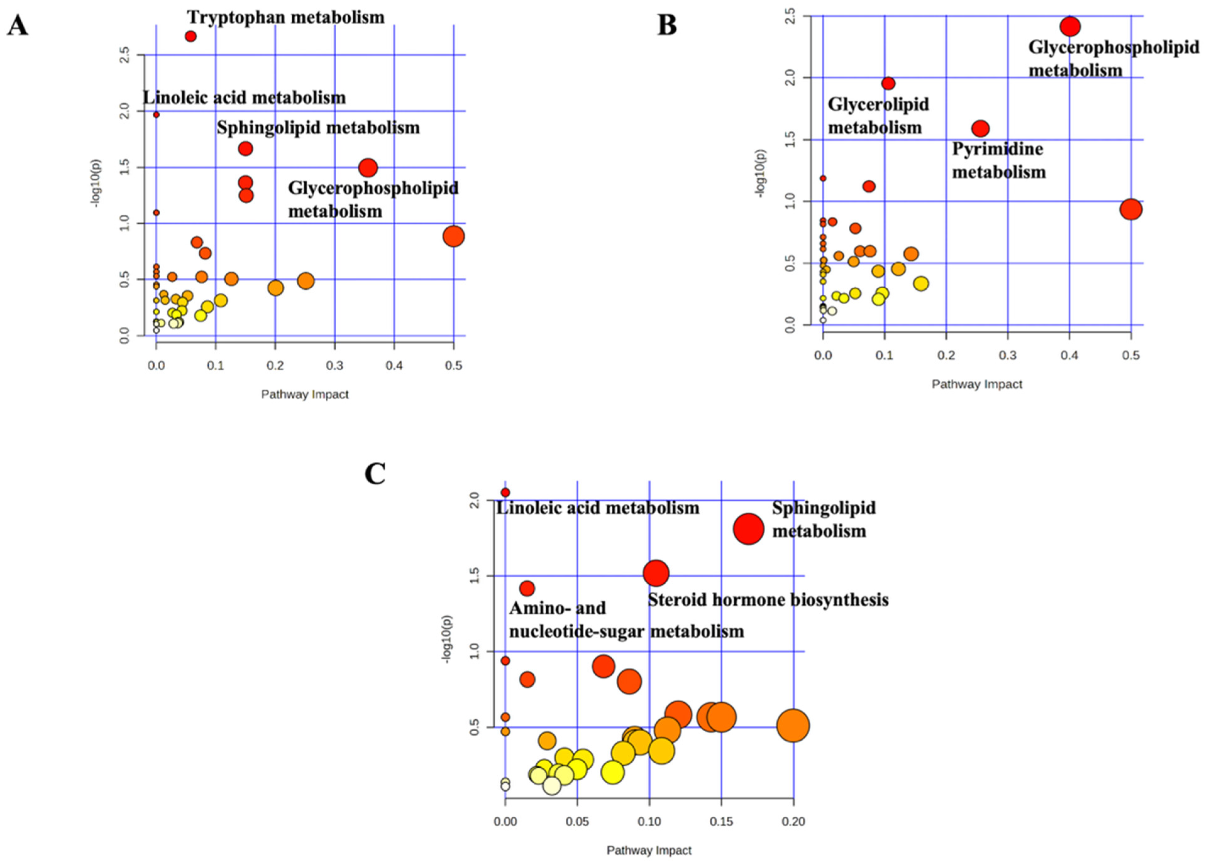 | Sphingolipid metabolism | 7 | −1.31 | L-Serine (VIP score: 2.372; AUC: 0.72; p-value: 8.8 × 10−3) |
