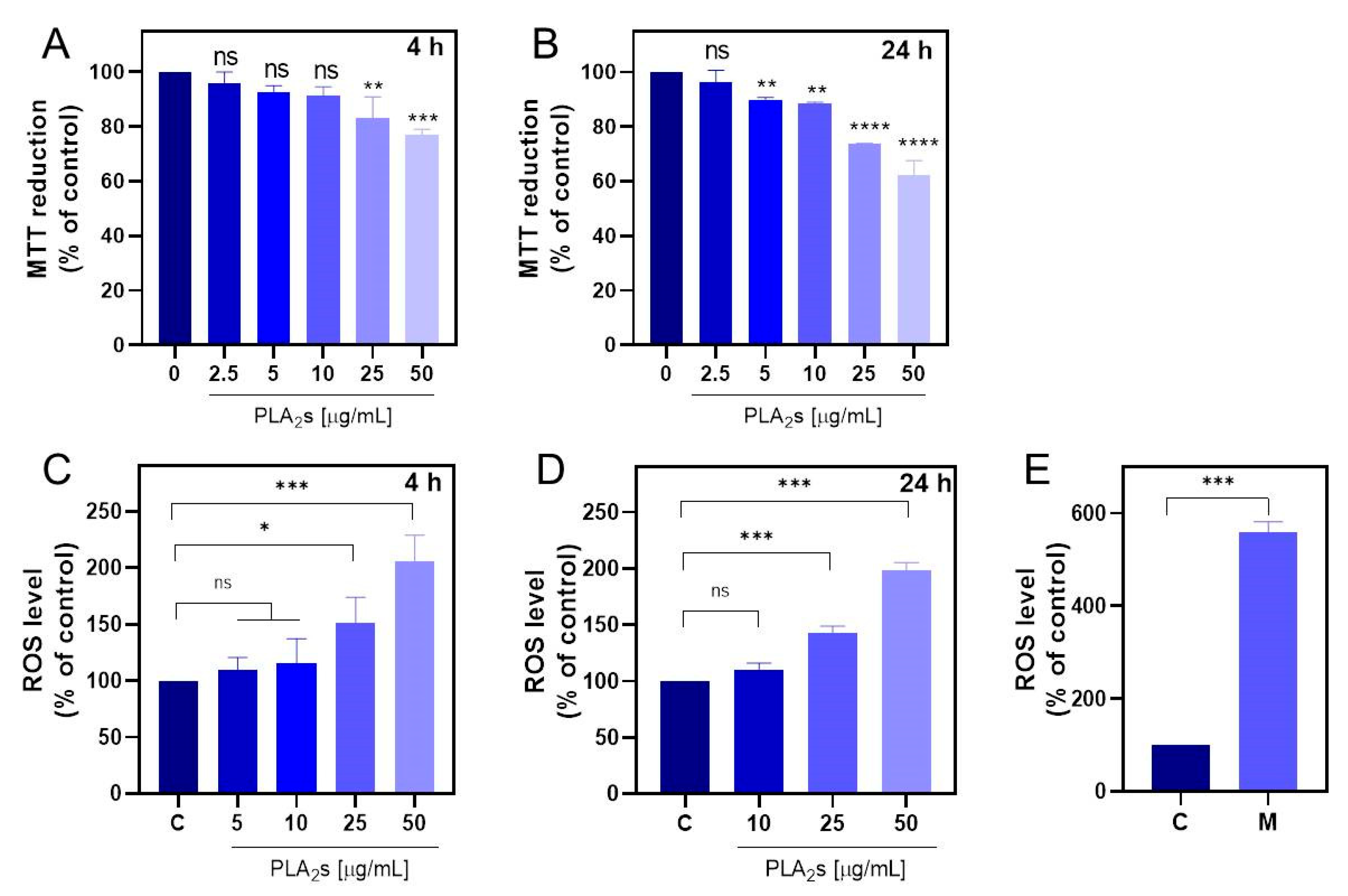 2.2. Effect of PLA2s on Redox Balance and mtROS Levels in MDA-MB-231 Cells