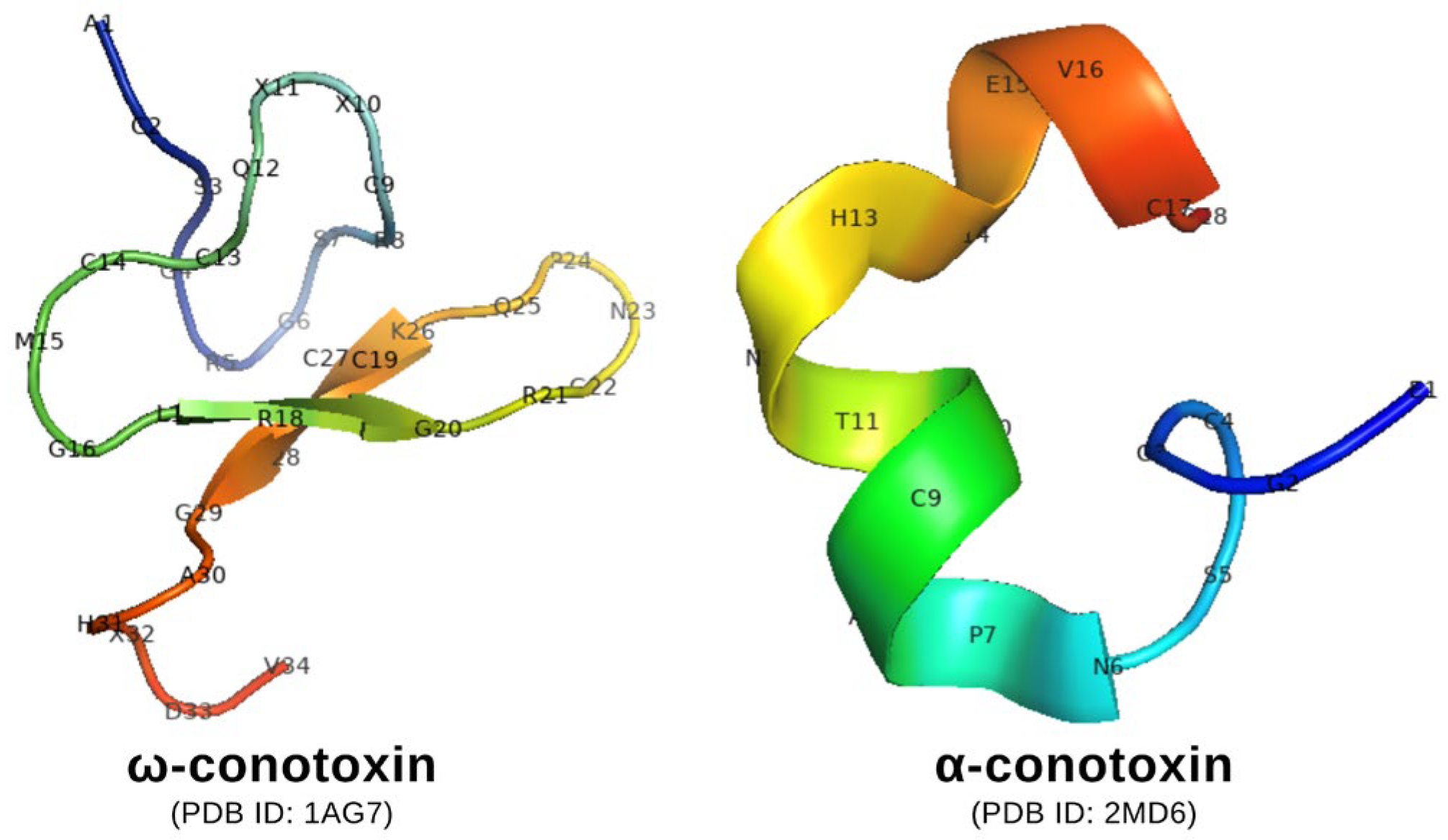 - Adams, D.J.; Callaghan, B.; Berecki, G. Analgesic conotoxins: Block and G protein-coupled receptor modulation of N-type (Ca(V) 2.2) calcium channels. Br. J. Pharmacol. 2012, 166, 486–500. [Google Scholar] [CrossRef]