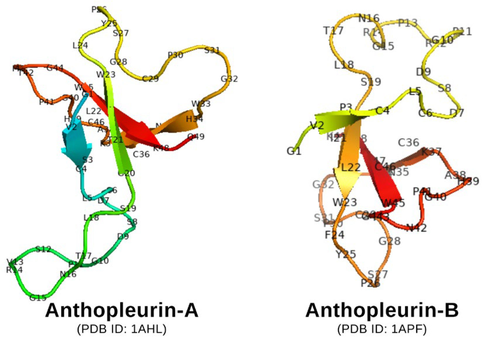 - Gallagher, M.J.; Blumenthal, K.M. Cloning and expression of wild-type and mutant forms of the cardiotonic polypeptide anthopleurin B. J. Biol. Chem. 1992, 267, 13958–13963. [Google Scholar] [CrossRef]