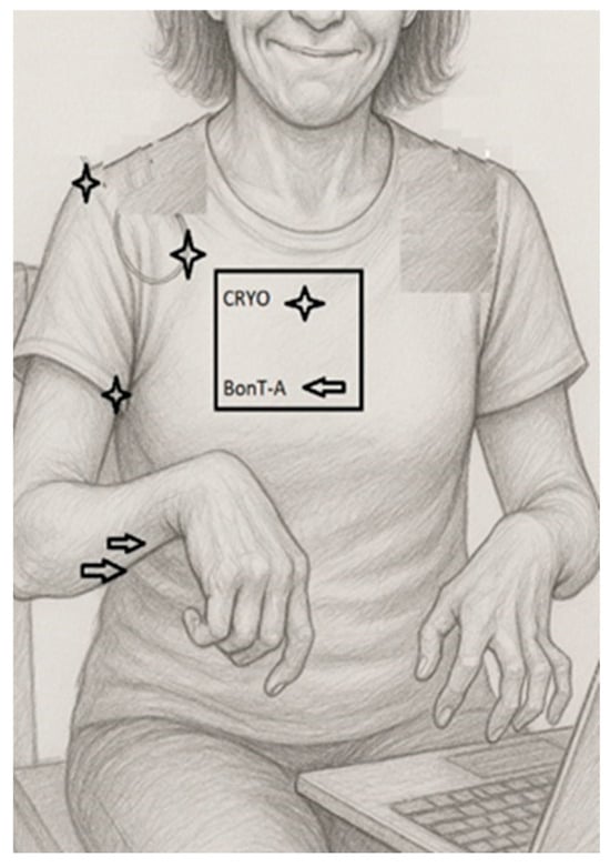 A grayscale pencil-style illustration of the patient shows the typical upper-limb spasticity posture: shoulder adduction and internal rotation, moderate elbow flexion, wrist flexion, and synergistic finger flexor overactivity that is more pronounced on the left side. The drawing highlights preserved voluntary control of the first three digits of the right hand, allowing for computer use, despite proximal spasticity. Illustrative markers indicate the proximal targets treated with ultrasound-guided cryoneurolysis (lateral, pectoral, and thoracodorsal nerves at the shoulder girdle) and the distal muscles treated with botulinum toxin type A (brachioradialis, flexor carpi radialis, and finger flexors). The baseline assessment included quantitative goniometric evaluation of the shoulder’s range of motion and pain assessment using a visual analogue scale (VAS), distinguishing pain at rest and during movement. Standardized functional outcome measures (e.g., DASH, ARAT) were not formally collected at the baseline, representing a limitation of this case report. Distal voluntary motor control of the fingers was preserved, based on qualitative clinical examination (Table 1). At the baseline, distal motor function was severely impaired. The patient was able to perform limited voluntary forearm pronation–supination (approximately 10–20°), slow wrist flexion–extension (10–20°), and minimal digit movement involving the first and second fingers in partial flexion. No functional grasp, grip, or pinch was present. Alternative approaches such as goal attainment scaling or caregiver-rated measures may represent feasible options in future similar cases.