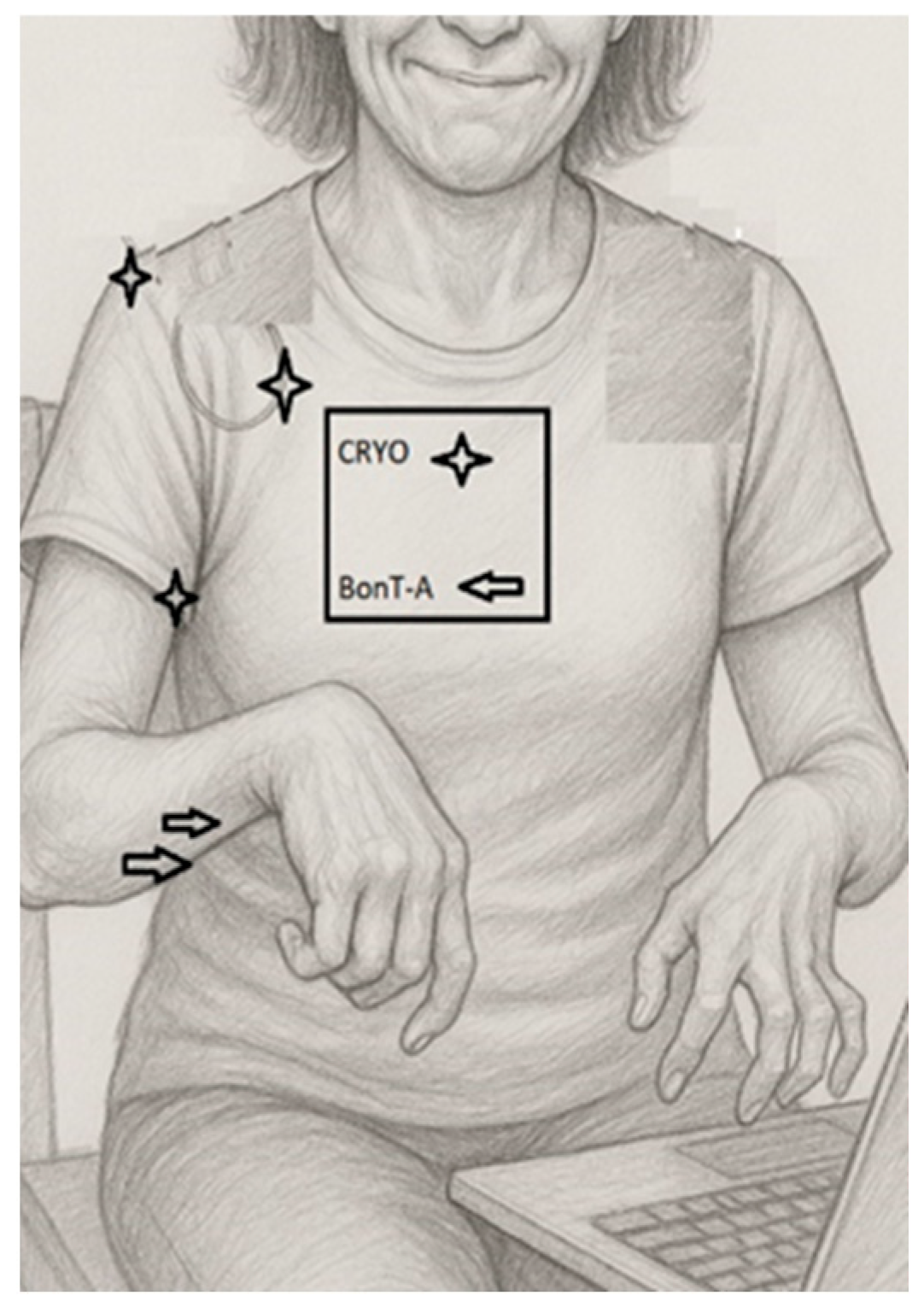 - Rubenstein, J.; Harvey, A.W.; Vincent, D.; Winston, P. Cryoneurotomy to Reduce Spasticity and Improve Range of Motion in Spastic Flexed Elbow: A Visual Vignette. Am. J. Phys. Med. Rehabil. 2021, 100, e65. [Google Scholar] [CrossRef] [PubMed]