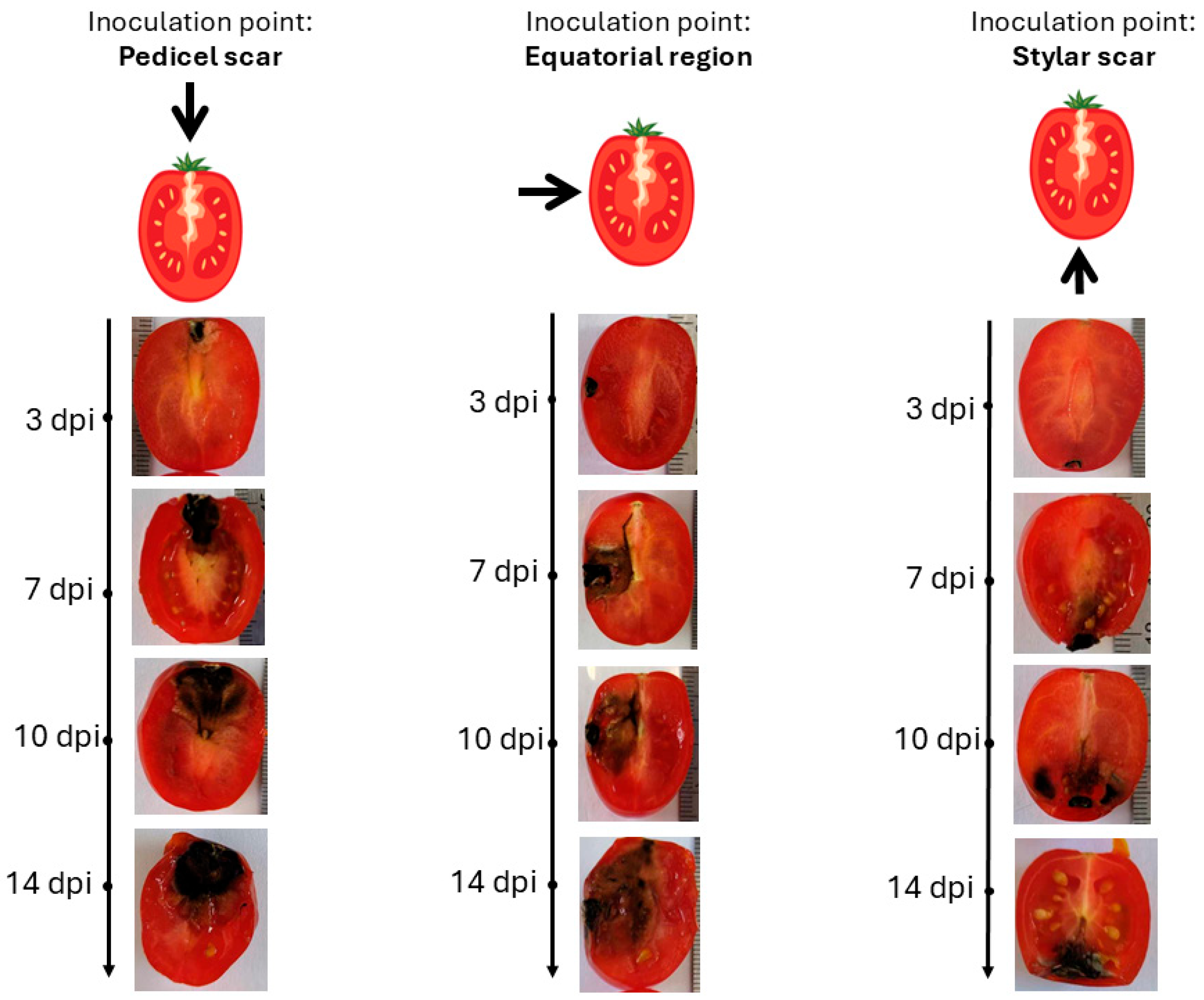 2.2. Inoculation Site Determines the Directionality and Depth of Fungal Migration in Tomato Tissues
