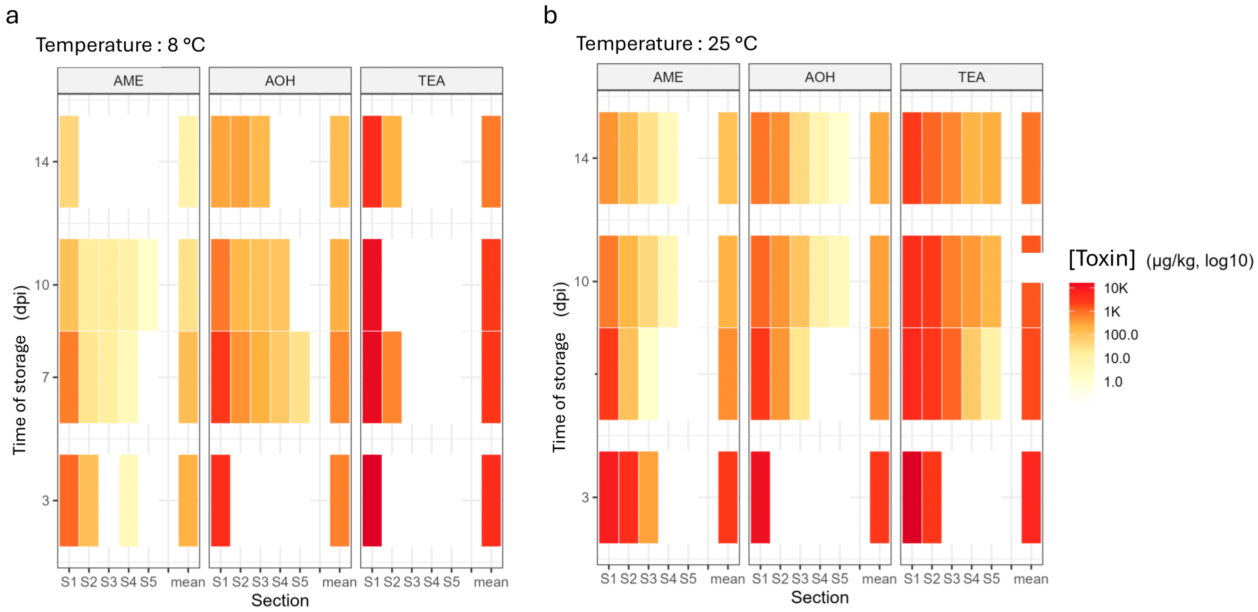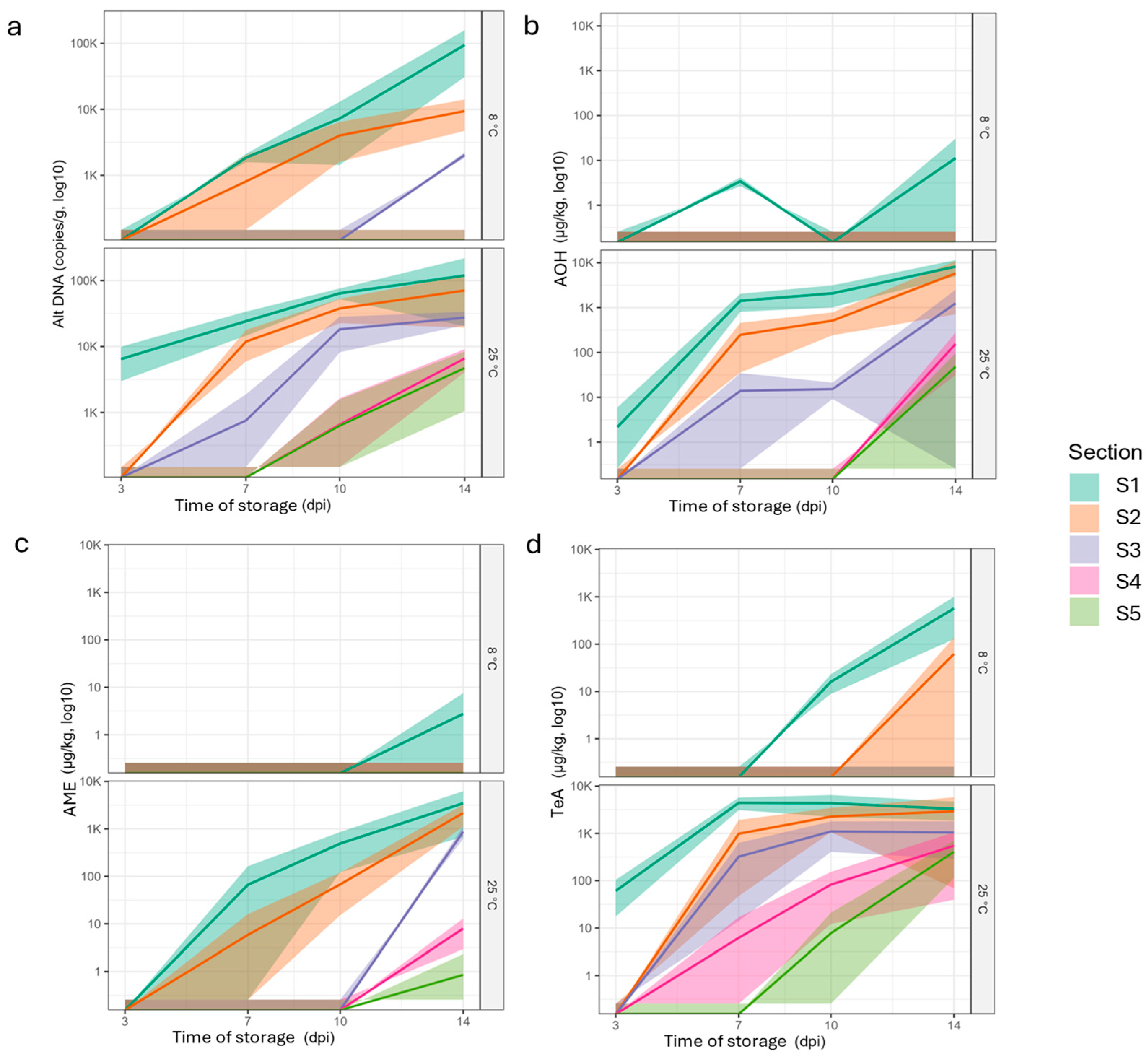 - Salotti, I.; Giorni, P.; Dall’Asta, C.; Battilani, P. Modeling Temperature Requirements for Growth and Toxin Production of Alternaria Spp. Associated with Tomato. Toxins 2025, 17, 361. [Google Scholar] [CrossRef]