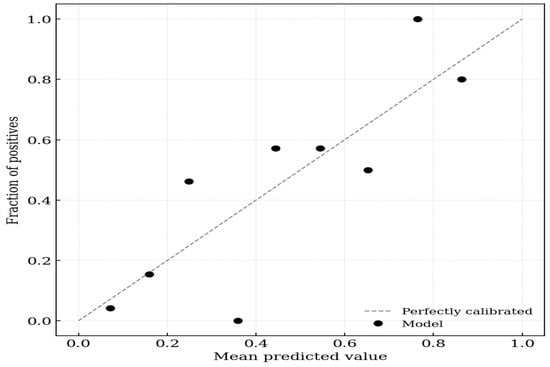 Calibration plot for aortic stiffness. The x-axis represents the mean predicted probability of the outcome, and the y-axis represents the observed fraction of positives. The dashed diagonal line represents perfect calibration (where predicted probability equals observed probability). The solid black circles indicate the model’s performance across 10 groups (deciles) of predicted risk.