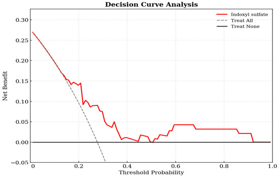 Decision curve analysis of the indoxyl sulfate-based logistic regression model for predicting aortic stiffness in kidney transplant patients. The y-axis measures the net benefit. The x-axis displays the threshold probability. The red solid line represents the net benefit of using the indoxyl sulfate prediction model. The gray dashed line represents the assumption that all patients have aortic stiffness (Treat All), while the black horizontal line represents the assumption that no patients have the condition (Treat None).