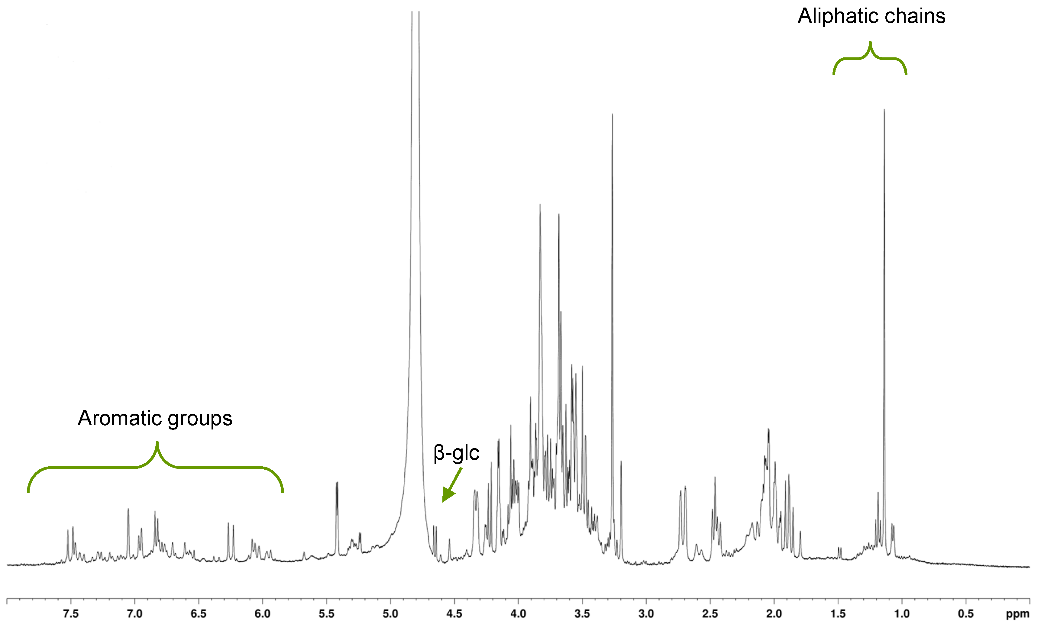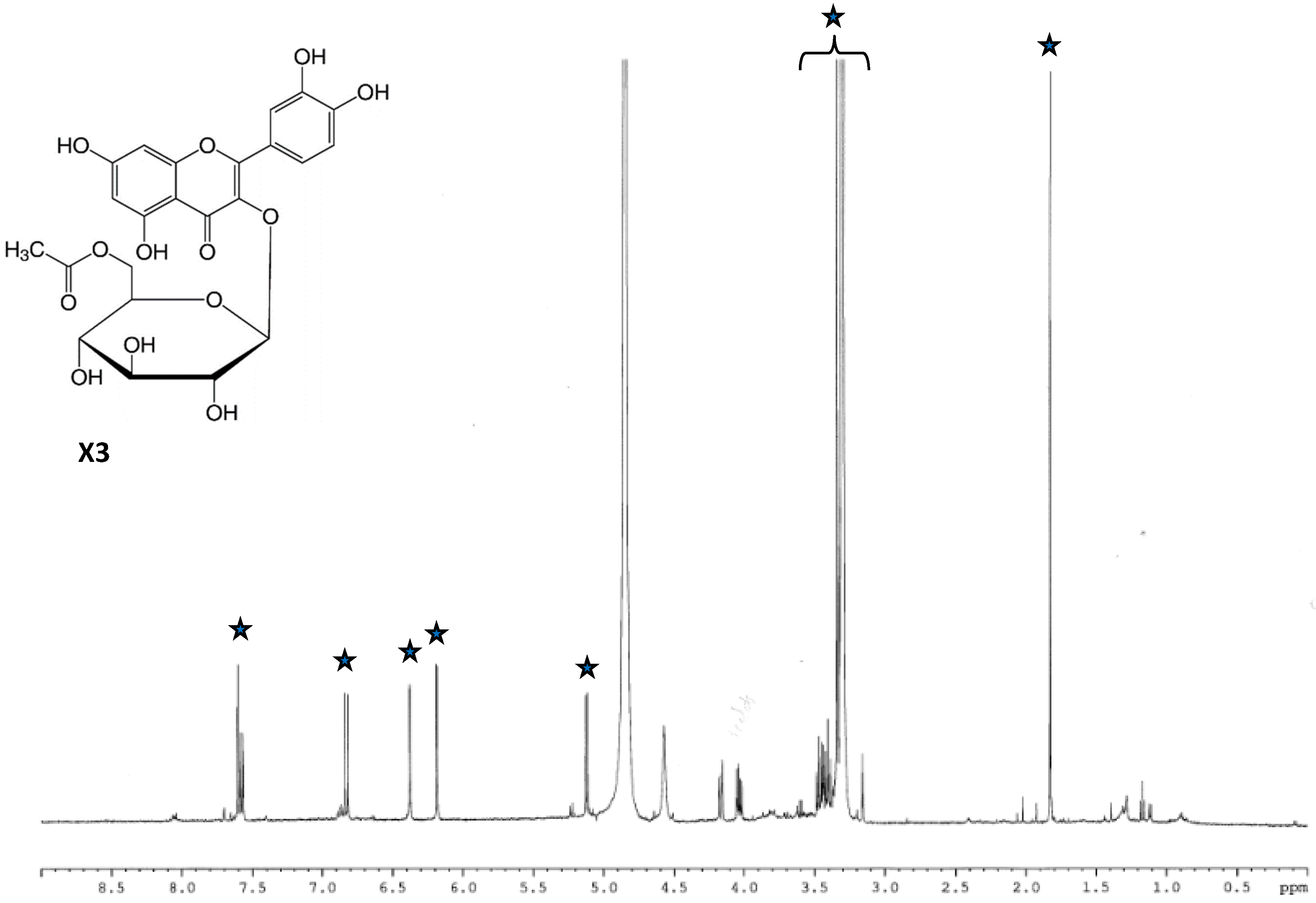 - 1H-NMR spectrum of the third sub-fraction (P3) showed several marked signals in the aromatic region, corresponding to quercetin (Figure 6). Moreover, previous 2D-NMR sequences confirmed the presence of a quercetin derivative (Supplementary data Figures S3 and S4), and acid hydrolysis provided a glucose residue and an acetate group. All together, the information collected for P3 allowed the identification of quercetin-3-O-glucose-6″-acetate as the major constituent of the third sub-fraction (Figure 6, X3).