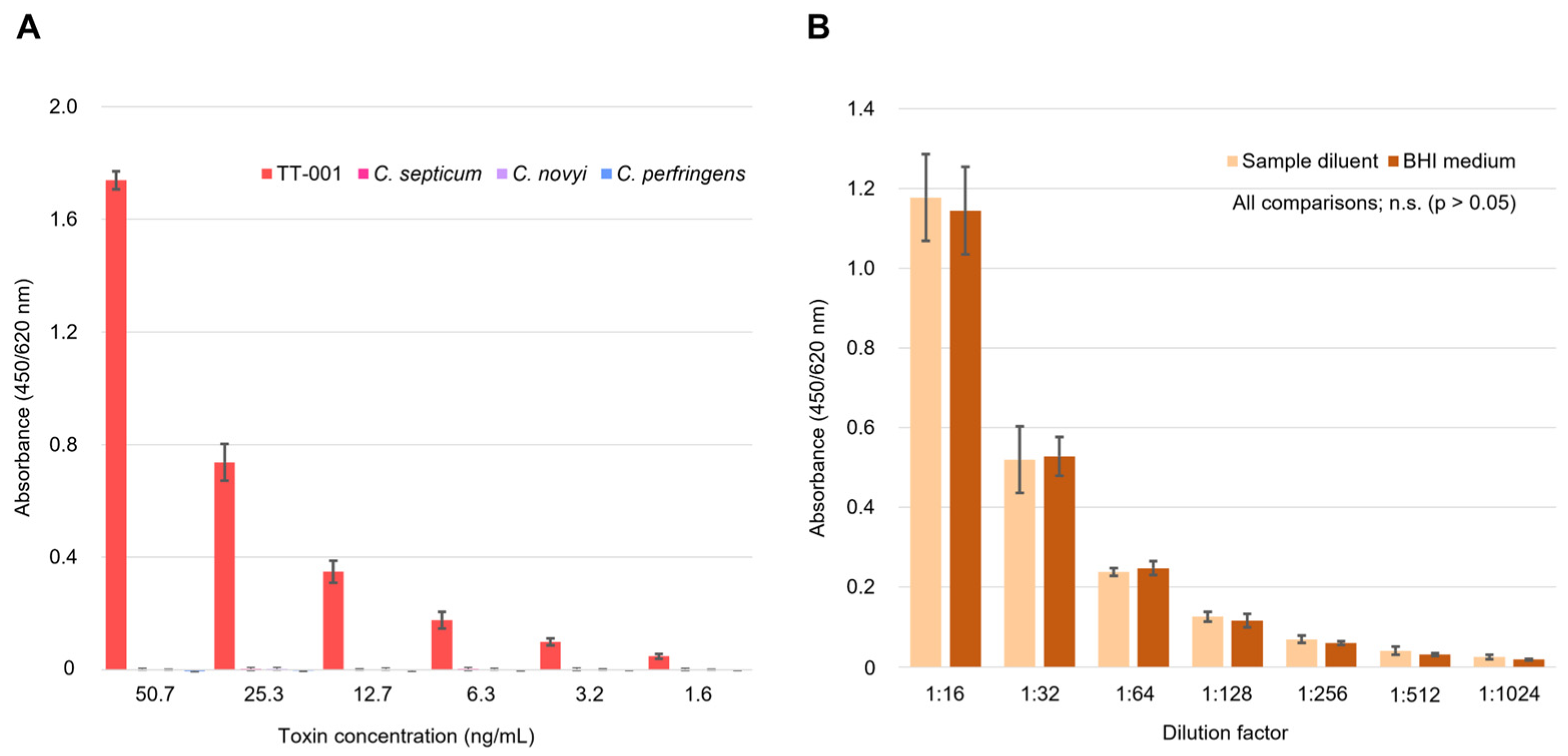 Cross-reactivity was assessed using toxins from other Clostridium species (C. septicum Lot.5, C. novyi Lot.4, and C. perfringens Lot.4; all obtained from National Institute of Infectious Diseases (NIID), Tokyo, Japan). Each heterologous toxin was tested in the same concentration range as the TT-001 calibration curve (n = 3), and cross-reactivity was calculated as the percentage of absorbance at the highest test concentration relative to TT-001 absorbance at the same concentration, with an acceptance criterion of <5%. Matrix interference was evaluated using the culture supernatant of KHSU-154301-001 diluted in both sample diluent and BHI medium, through parallel line assay. The acceptance criterion was set at p > 0.05 (n = 3), and statistical analysis was performed using unpaired t-test to compare the two matrices.