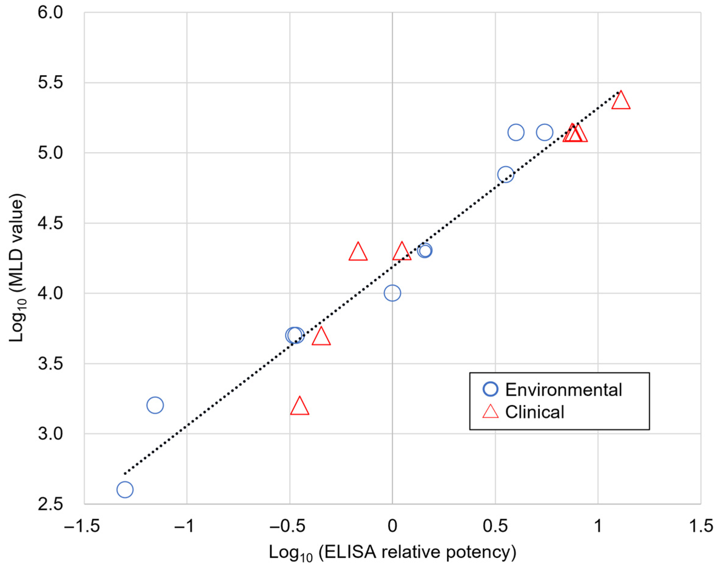 50 reflects this inherent biological difference, where immunologically detectable but biologically inactive toxin molecules can result from protein degradation, conformational changes, or aggregation during culture storage. Despite this inherent limitation, correlation analysis between ELISA relative potency values and observed MLD values for all 18 isolates revealed a robust positive correlation (r = 0.974,