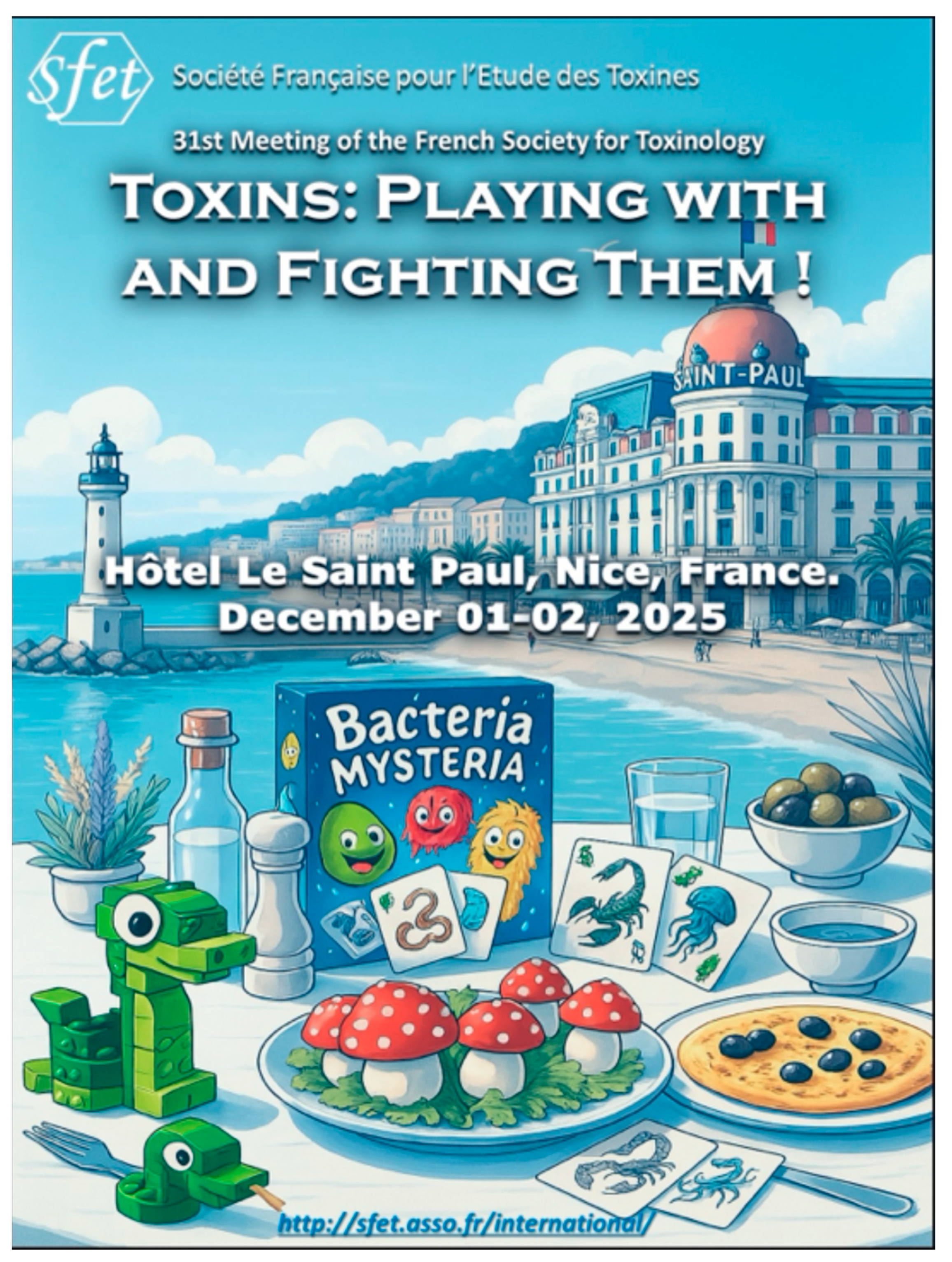 http://sfet.asso.fr/international, English site accessed on 16 February 2010) was held on 1–2 December 2025 at Hôtel Le Saint Paul in Nice, France. After 29 editions in Paris, that was the second time that the meeting was held on the French Riviera. The central theme of the year was “Toxins: Playing with and fighting them”, as reflected in the announcement poster (