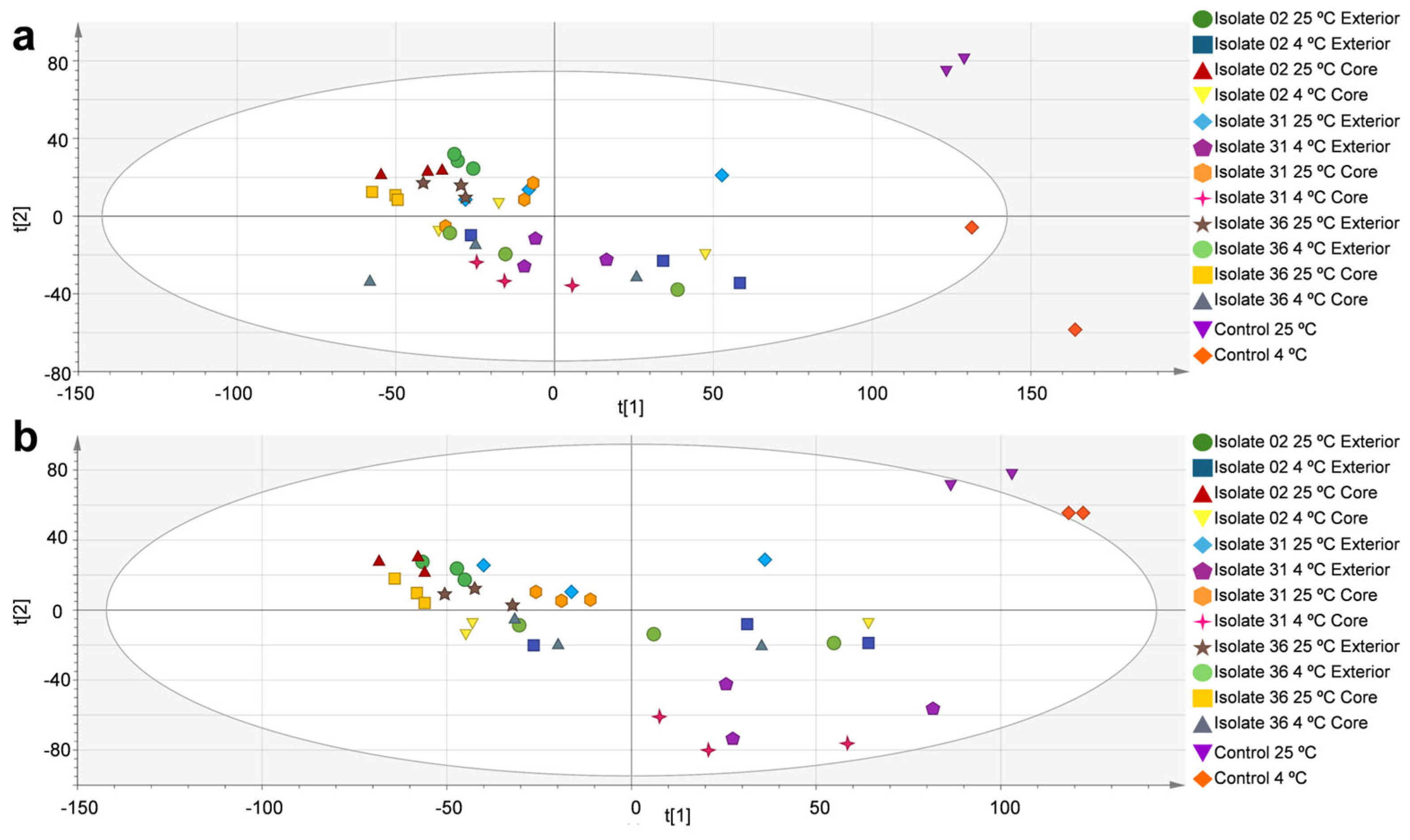 2]). In both analyses, the control samples (at 25 °C and 4 °C) were separated from the infected apples, regardless of strain, inoculation site or incubation temperature. The control samples were consistently grouped at the right end of the score plots, where the highest positive values were found for principal component 1 (t [