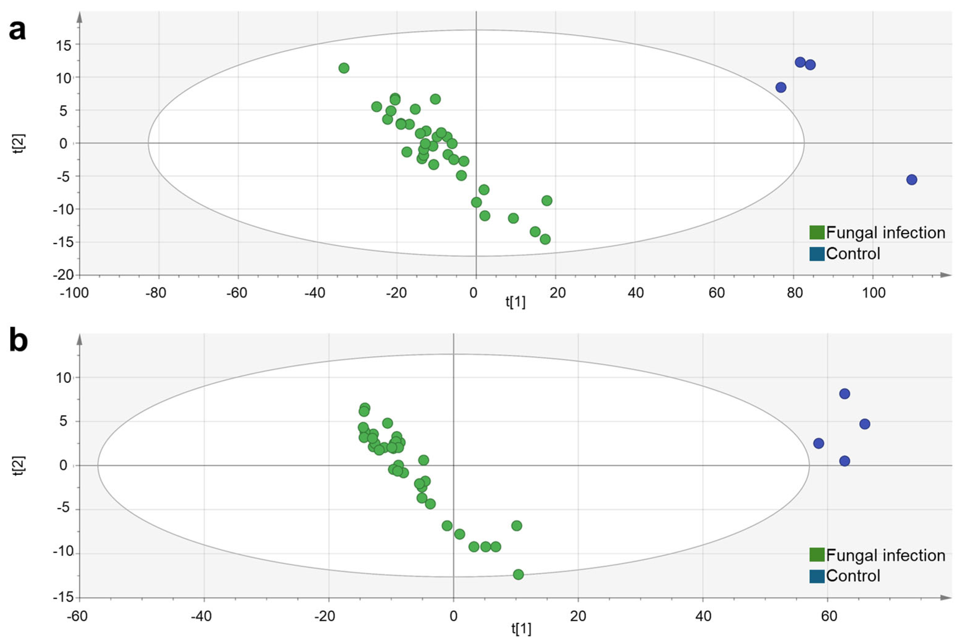 1]). This differential distribution confirms that infection is the predominant factor in the variation in the metabolic profile captured by the model. The ellipses shown in the PCA score plots represent the 95% confidence interval of the Hotelling T