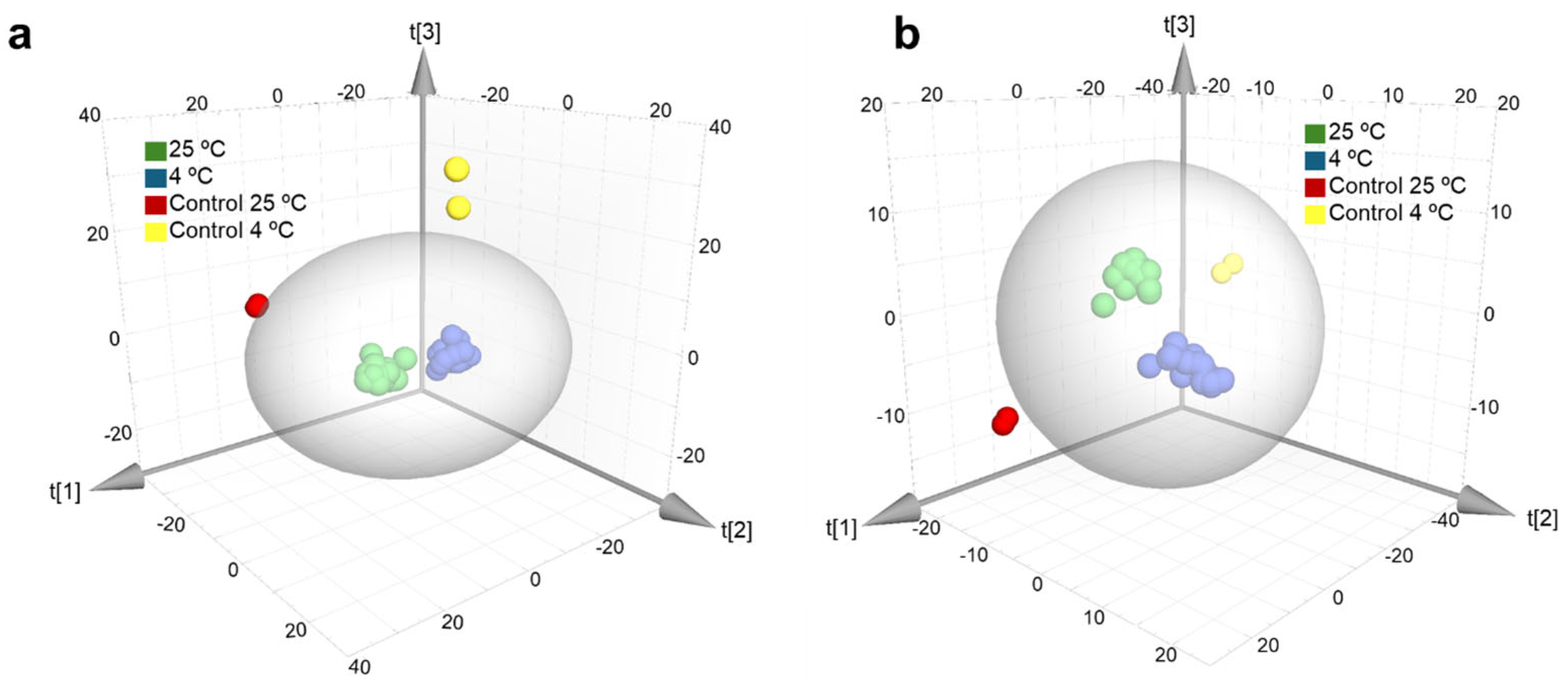 Then, the study examined whether the metabolomic profile could be discriminated based on the temperature at which the apples had been incubated. The results of the PLS-DA models using data acquired in ESI
