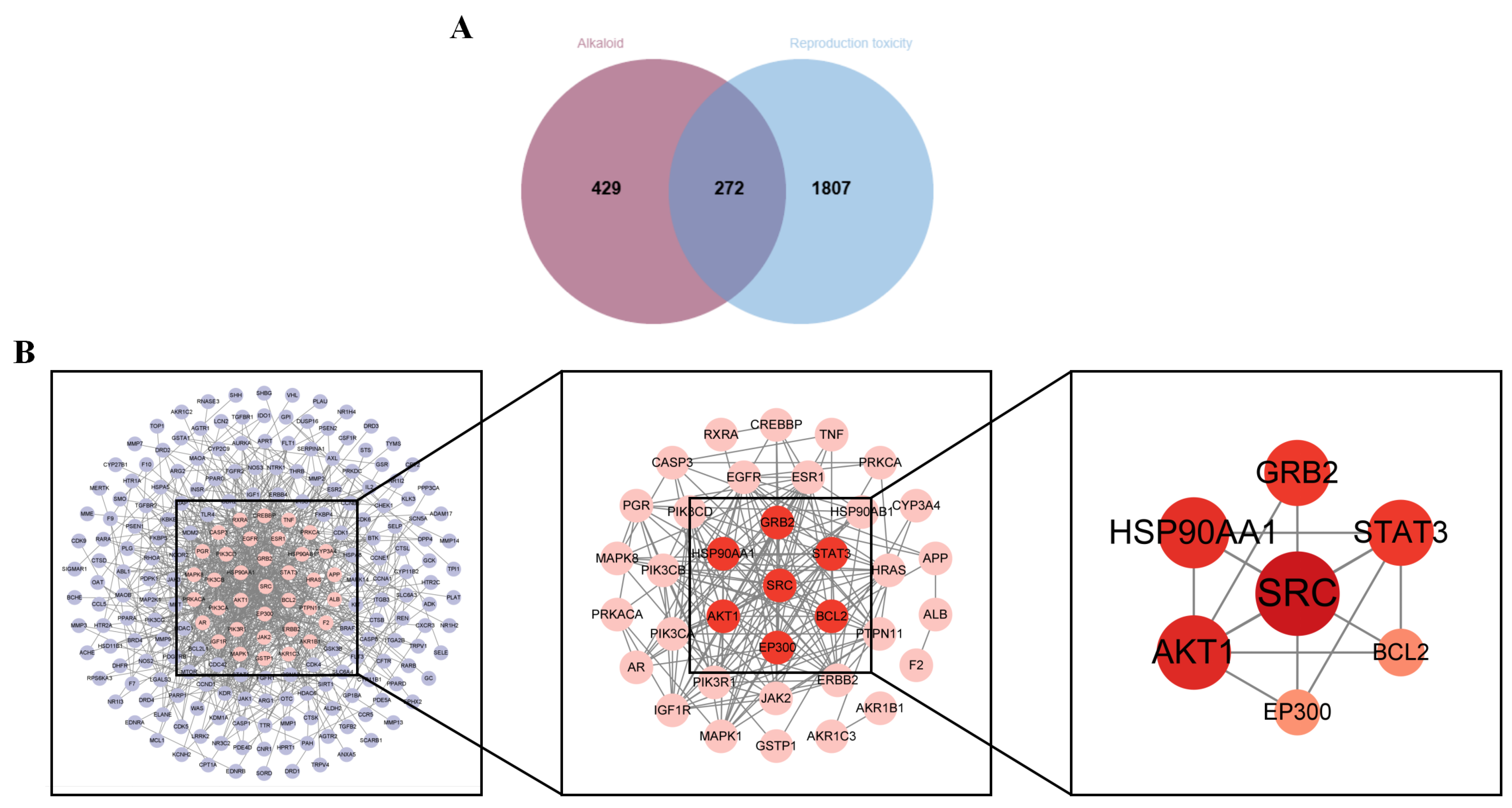 4.9.5. Construction of “Alkaloid Components–Reproductive Toxicity Targets–Pathways” Network